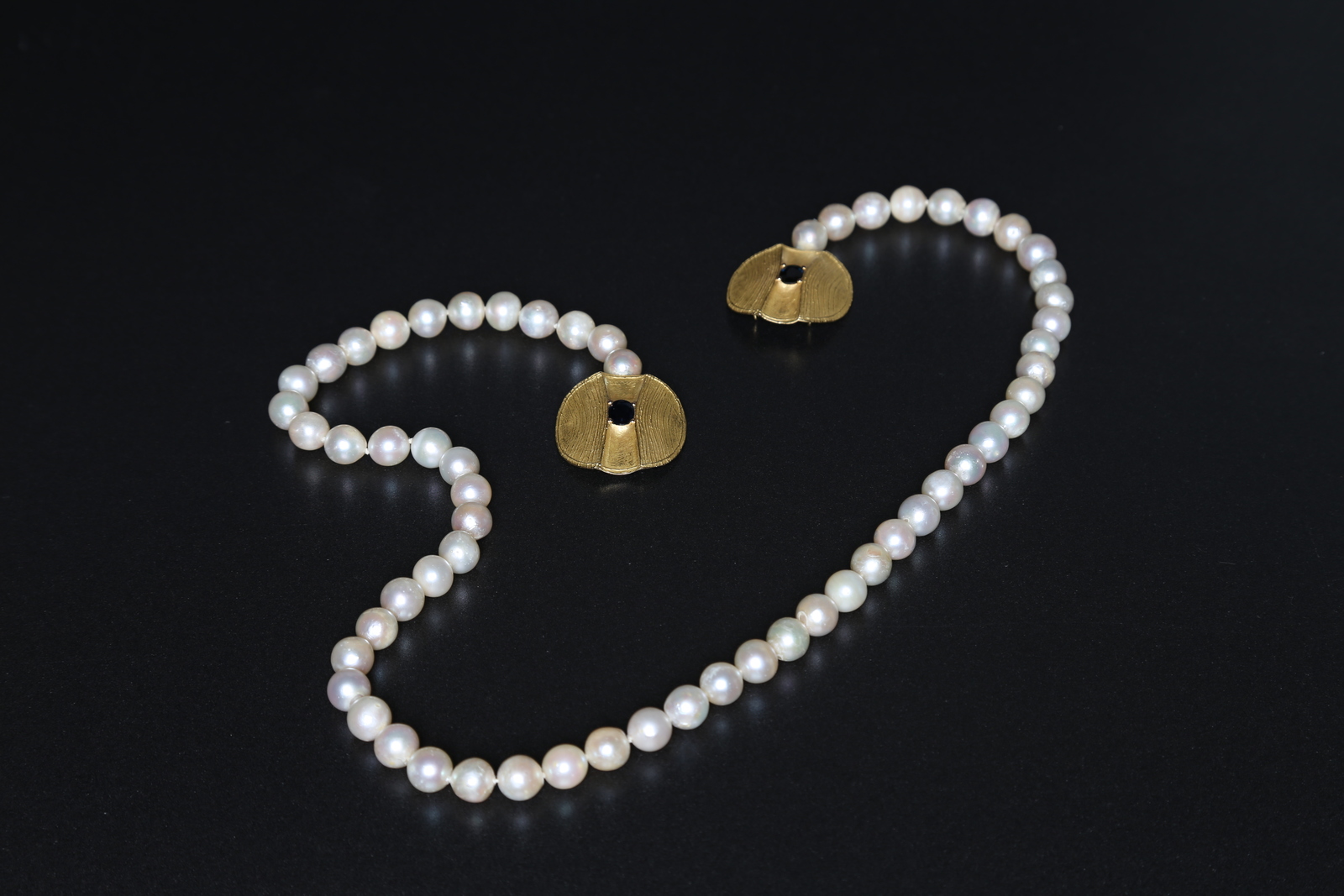 PINTON MARIO Collana. Oro e perle. Cm 68,00. Pezzo unico. Realizzata su commissione privata per la nobildonna padovana Ester Abate Sottocasa. Filo di perle giapponesi con fermaglio scultoreo in oro realizzato a cera persa in cui sono stati incastonati due zaffiri Cylon dalla splendida luce. Firma all'interno e all'esterno del fermaglio. Dimensione zaffiri: 6,5 x 8,5 mm cad. Numero di perle : 60 di 1 cm di diametro.