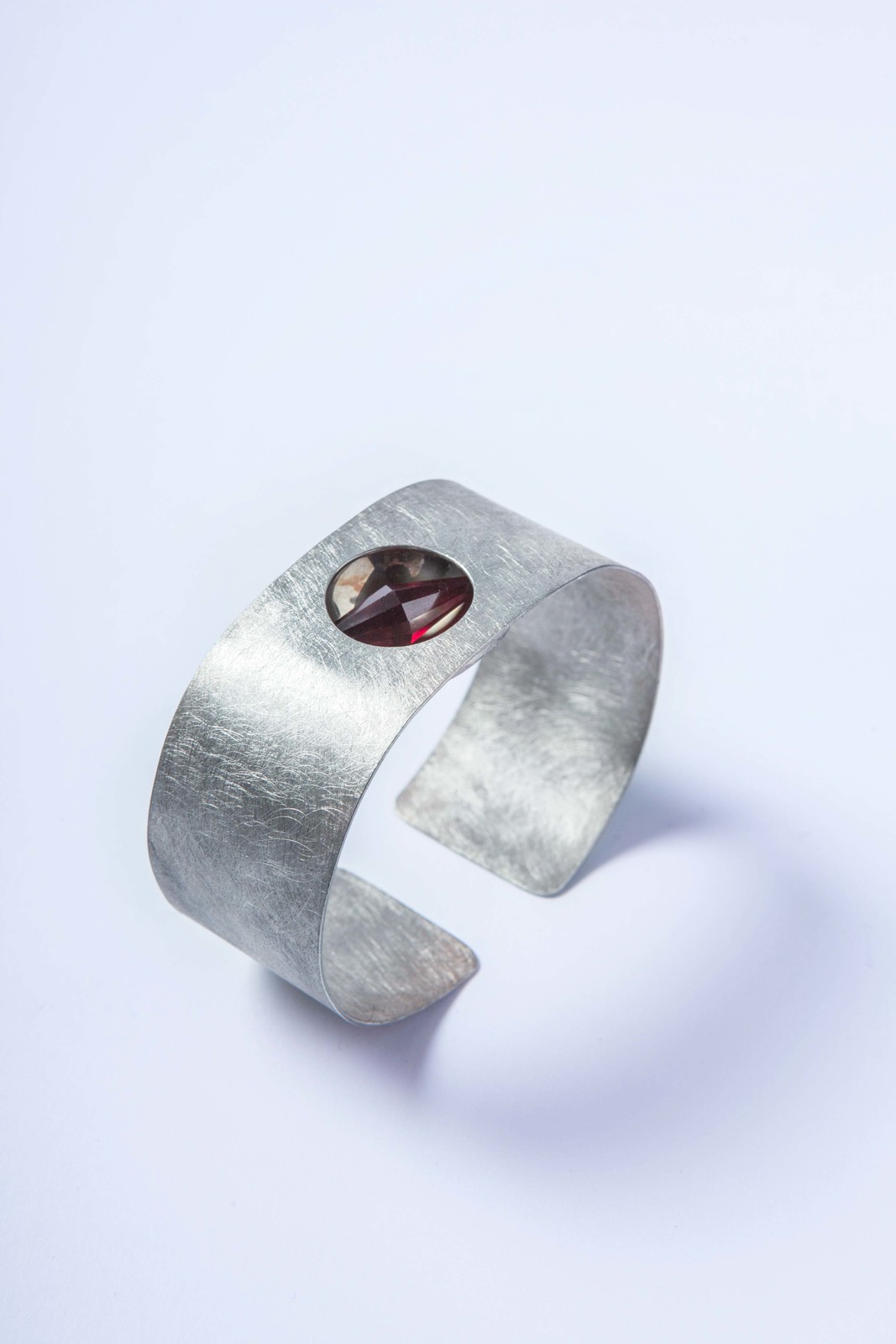 VITA ALBERTA (n. 1956) Bracciale movimento rotondo. 2004. Argento e spinello rosso.. Cm 7,00 x 6,00. Costruito a mano con lastre satinate.