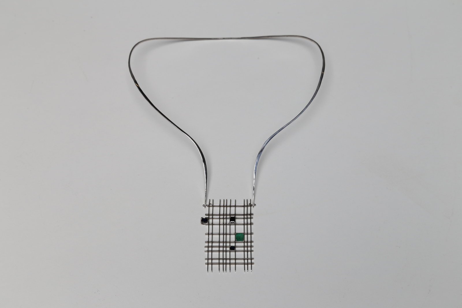 PINTON MARIO Collier in oro bianco con zaffiri e smeraldo. Oro bianco,zaffiri e smeraldo. Cm 0,10 x 15,00. Per Atelier Des Orfedres, Padova. Collier della metà degli anni '60.