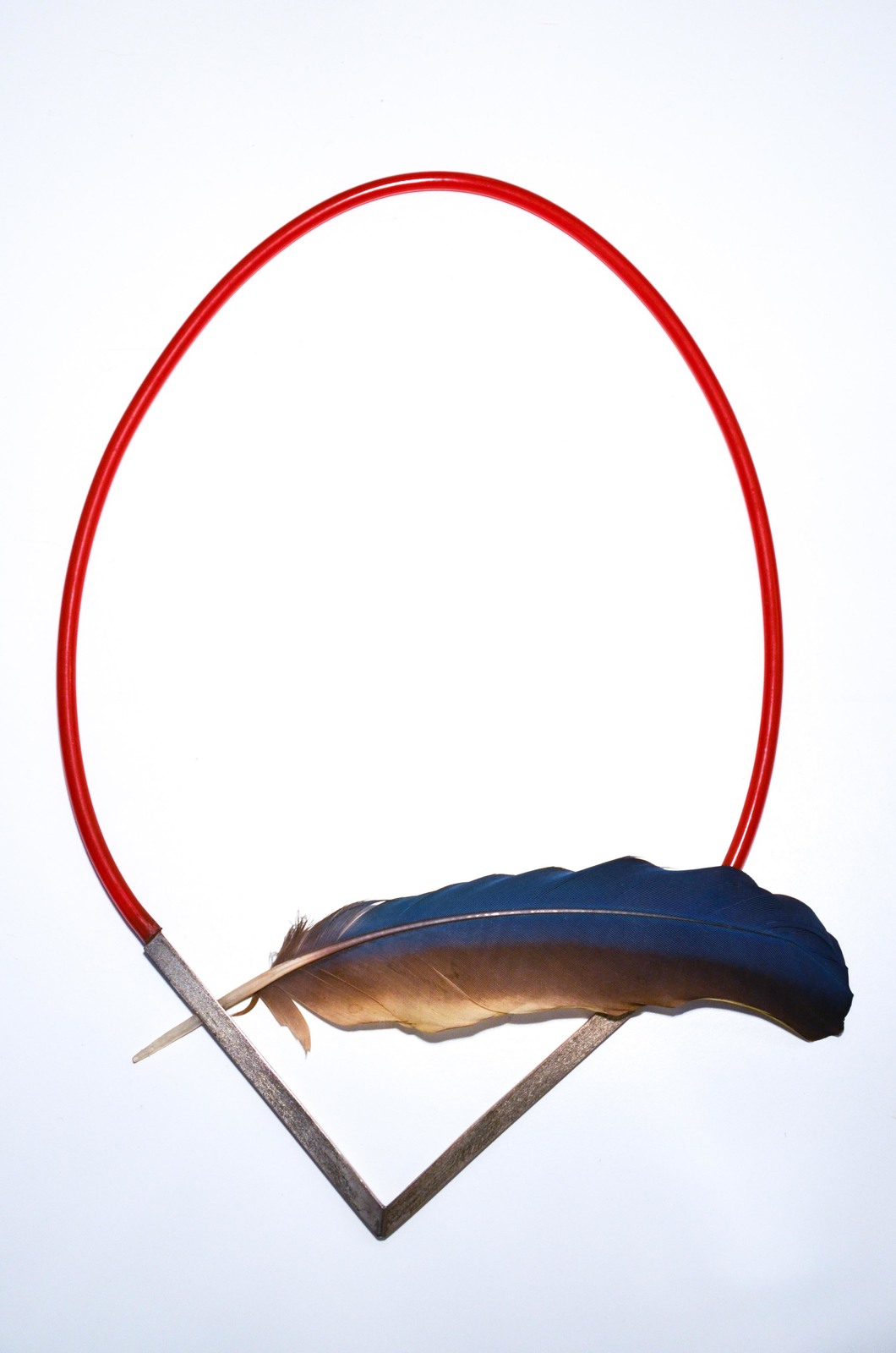 VITA ALBERTA (n. 1956) Collier Iside. 1991. Argento satinato caucciu' e piuma. Cm 20,00 x 30,00. Costruita a mano in lastra sezione triangolare satinata con vera piuma e cordino in caucciù.