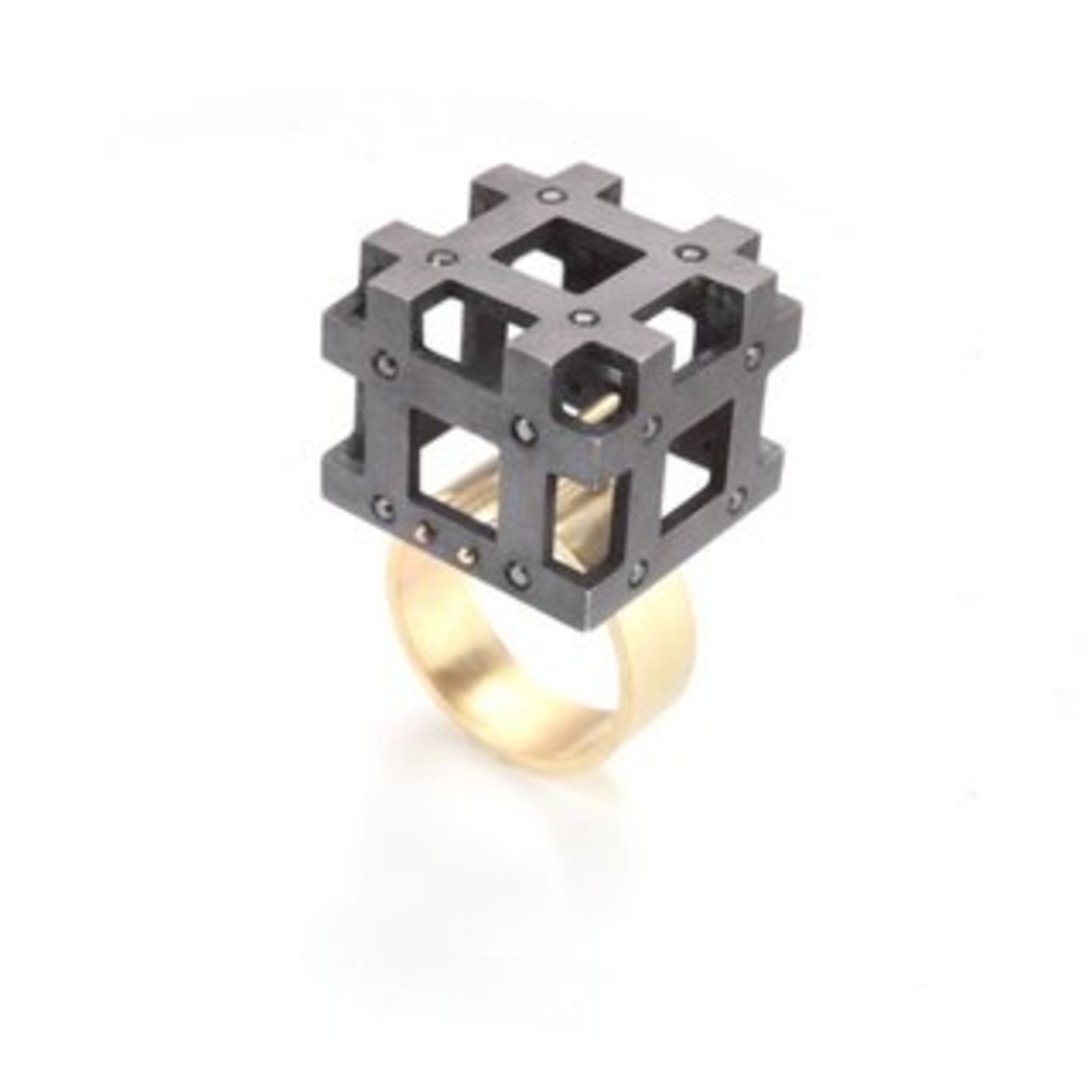 REVEANE PIERGIULIANO (n. 1943) Anello Cubo. 2013. Oro, argento ossidato e...