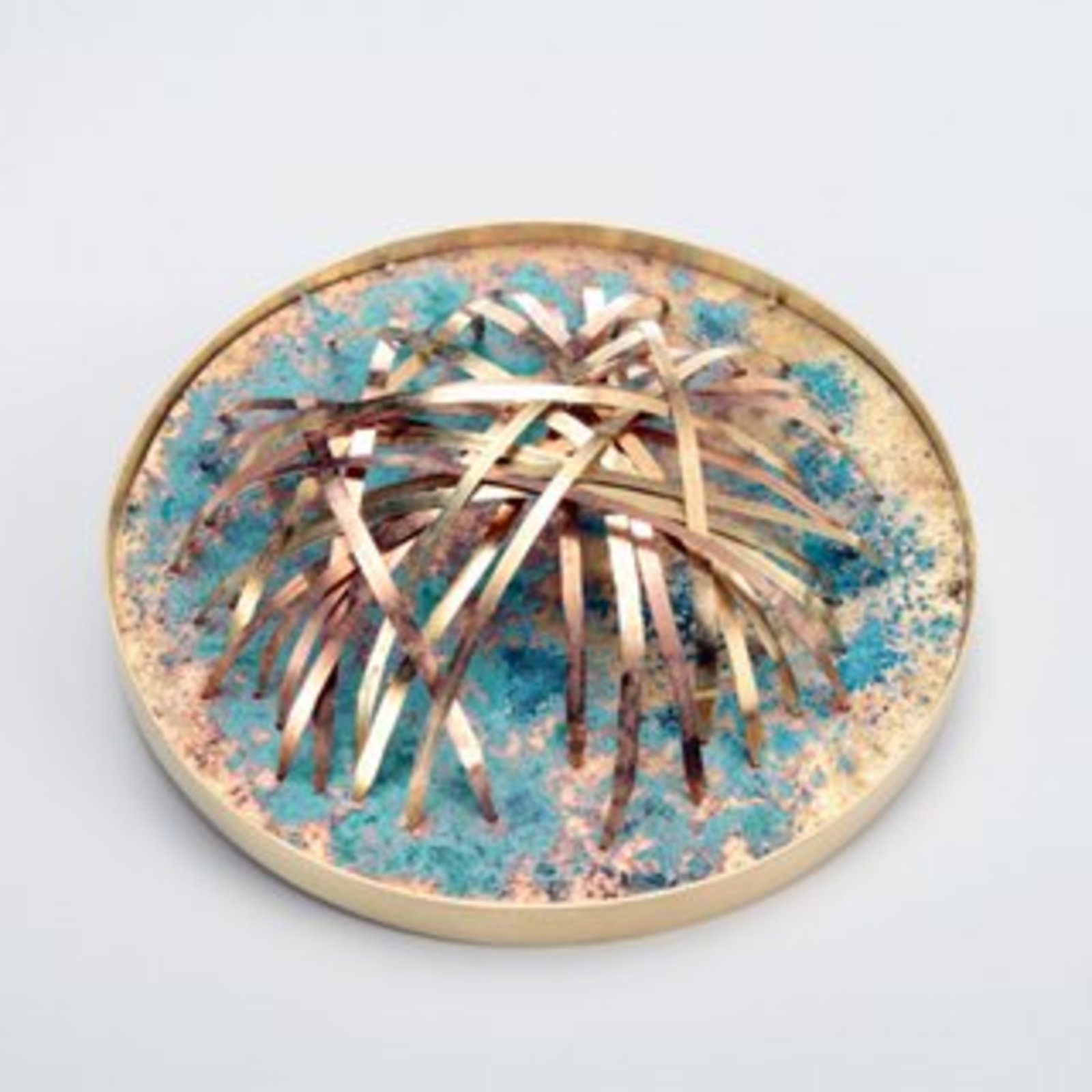 REVEANE PIERGIULIANO (n. 1943) Spilla Intrecci. 2012. Oro giallo, rosso, verde e rame ossidato. Cm 2,10 x 7,00.
