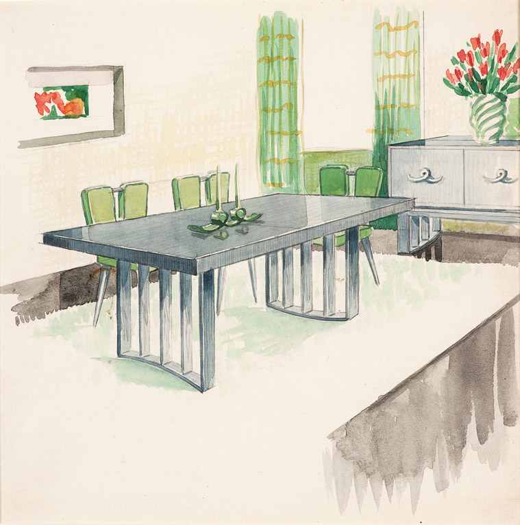 VINICIO PALADINI Mosca 1902 - Roma 1971 BOZZETTO DI MOBILI E ARREDAMENTO D’INTERNO, 1945/1950 acquarello su cartone, cm 23x26,4. Bibliografi a: G. Lista, Dal futurismo all’immaginismo: Vinicio Paladini, Ed. Il Cavaliere Azzurro, Bologna 1988, n. 80, p. 92 riprodotto.