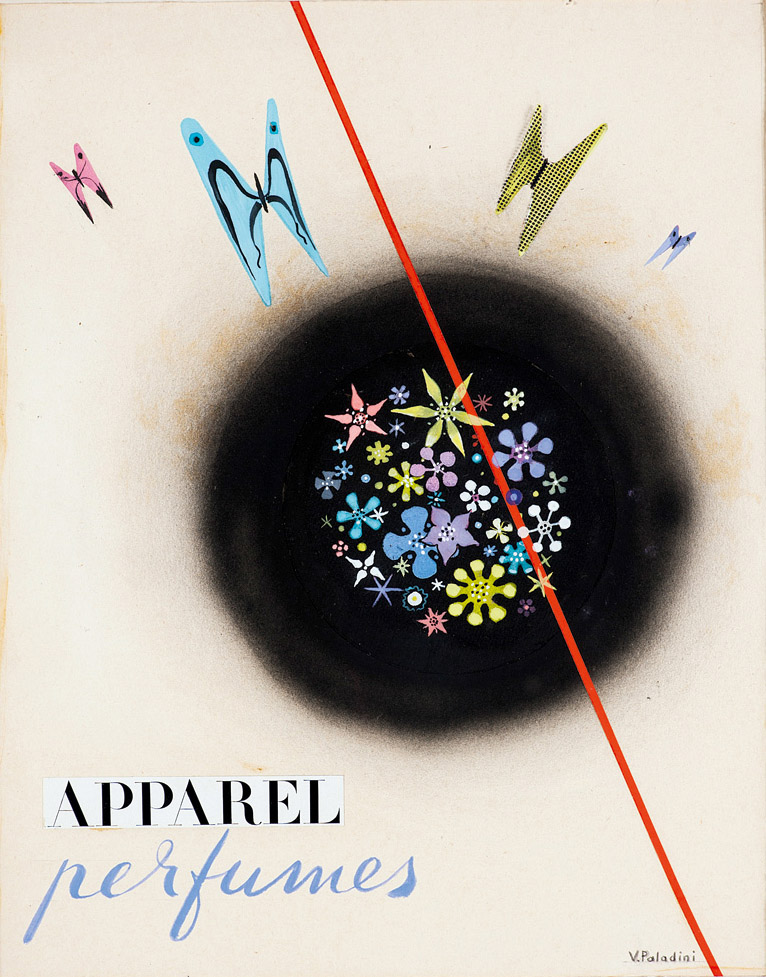 VINICIO PALADINI Mosca 1902 - Roma 1971 COMPOSIZIONE PUBBLICITARIA APPAREL PERFUMES, 1952 tempera, pastello e collage su cartone, cm 50,6x33,4. Firmato in basso a destra: V. Paladini Bibliografi a: G. Lista, Dal futurismo all’immaginismo: Vinicio Paladini, Ed. Il Cavaliere Azzurro, Bologna 1988, n. 87, p. 94 riprodotto.