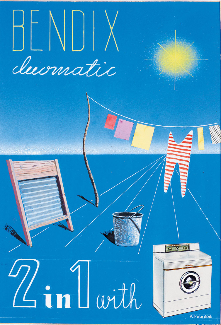 VINICIO PALADINI Mosca 1902 - Roma 1971 COMPOSIZIONE PUBBLICITARIA BENDIX, 1952 tempera e collage su cartone, cm 51x38,4. Firmato in basso a destra: V. Paladini Esposizioni: Roma, Galleria d’Arte del Comune di Roma, Palazzo delle Esposizioni, marzo 1958. Bibliografi a: G. Lista, Dal futurismo all’immaginismo: Vinicio Paladini, Ed. Il Cavaliere Azzurro, Bologna 1988, n. 88, p. 94 riprodotto.