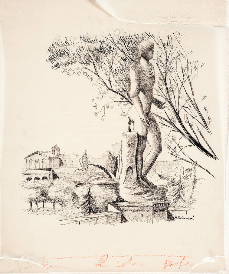 VINICIO PALADINI Mosca 1902 - Roma 1971 VILLA CELIMONTANA, ROMA, 1933 china su carta, cm 41,5x31,5. Firmato in basso a destra: V. Paladini Bibliografi a: G. Lista, Dal futurismo all’immaginismo: Vinicio Paladini, Ed. Il Cavaliere Azzurro, Bologna 1988, n. 47, p. 80 riprodotto.