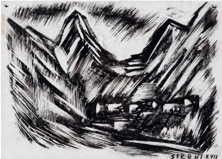 MARIO SIRONI Sassari 1885 – Milano 1961 MONTAGNE E CASE, 1930 CIRCA grafi te...