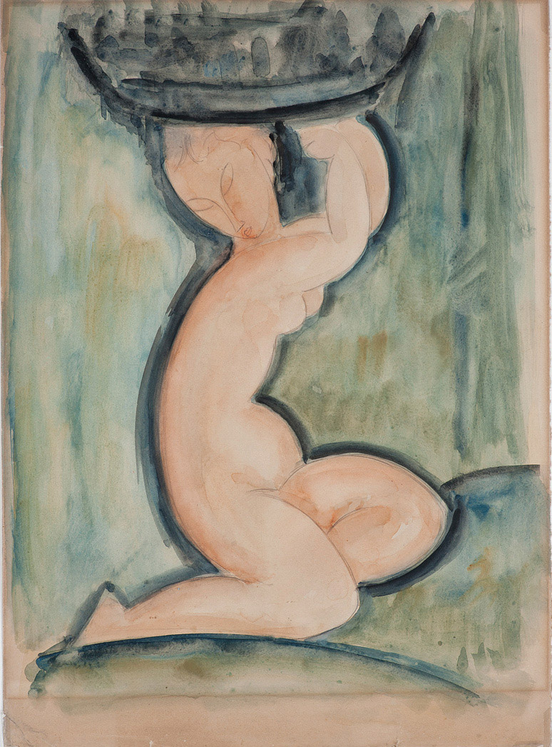AMEDEO MODIGLIANI Livorno 1884 – Parigi 1920 CARIATIDE tecnica mista su cartone, mm 520x372. Provenienza: Parigi, Zborowski; Milano, collezione Enrico Piceni; Milano, collezione privata. Esposizioni: Milano, Rotonda della Besana, Disegni di Modigliani, 1982. Bibliografi a: O. Patani, Amedeo Modigliani - Catalogo generale. Sculture e disegni 1909-1914, Ed. Leonardo, Milano 1991, pag180, riprodotto; Disegni di Modigliani, catalogo della mostra, Ed. Mazzotta, Milano 1982, pag 37, riprodotto.