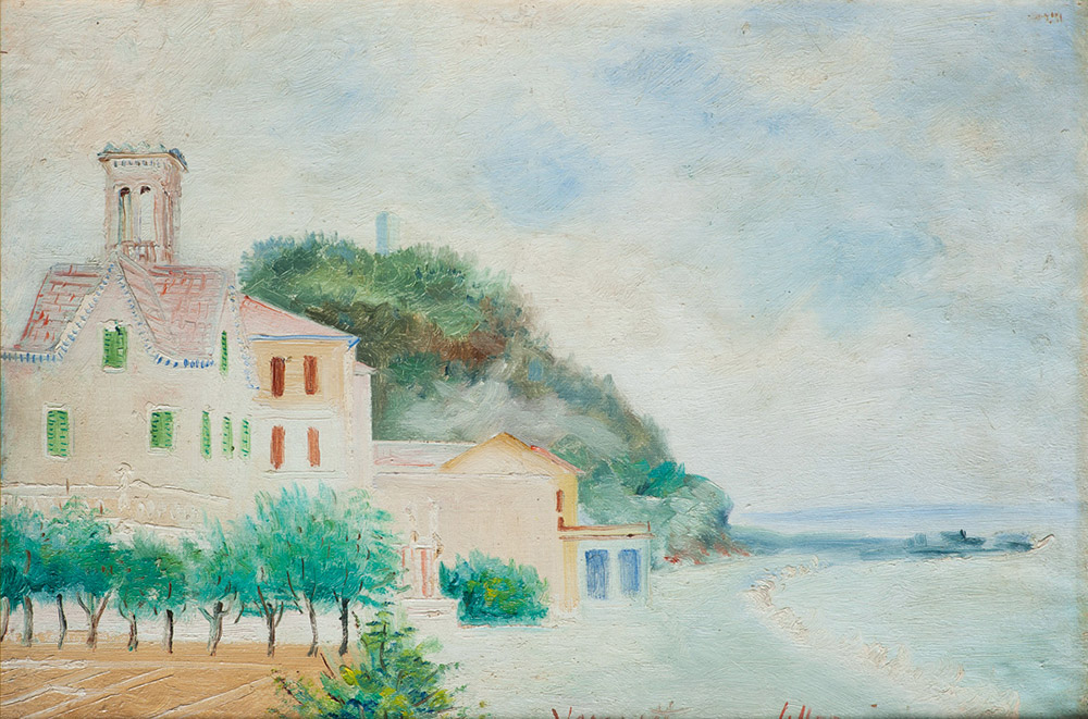 UMBERTO LILLONI Milano 1898 – 1980 LA PUNTA DI VARIGOTTI, 1953 olio su tela, cm 38x55. Titolo e fi rma in basso: Varigotti – Lilloni Titolo, data e fi rma al verso: La Punta di Varigotti. 1953. Umberto Lilloni Iscritto al verso: di mano di Umberto Lilloni. Renata Lilloni. Milano, 17 maggio1997 Provenienza: Milano, Studio Lilloni (timbro al verso); Milano, Galleria d’Arte Gavioli (timbro al verso); Milano, collezione privata.