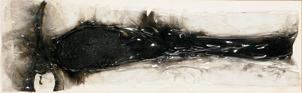 ALBERTO BURRI Città di Castello 1915 – Nizza 1995 COMBUSTIONE, 1968 plastica, acrilico, combustione su cartoncino, cm 12x39. Dedicato, fi rmato e datato al verso: All’amico Gaggi, Burri, Grottarossa 1968 Provenienza: Collezione privata. Esposizioni: Gubbio, Park Hotel ai Cappuccini, Mostra Bibliografi a: G. Cascetta (a cura di), Mostra di Arte Contemporanea, catalogo della mostra, Gubbio 1999, cop. col., n. 1, tav. col; M. Vallora (a cura di), I “neri” di Burri, Mazzotta, Milano 2003, pag 26 (riprodotto); B. Corà (a cura di), Burri. Catalogo generale, Fondazione Palazzo Albizzini Collezione Burri, Città di Castello 2015, Tomo II, tav. 1184, pag 217 (riprodotto), Tomo VI, n. i.6853, pag 179 (riprodotto). Opera archiviata presso la Fondazione Palazzo Albizzini Collezione Burri con il numero d’inventario 68.53