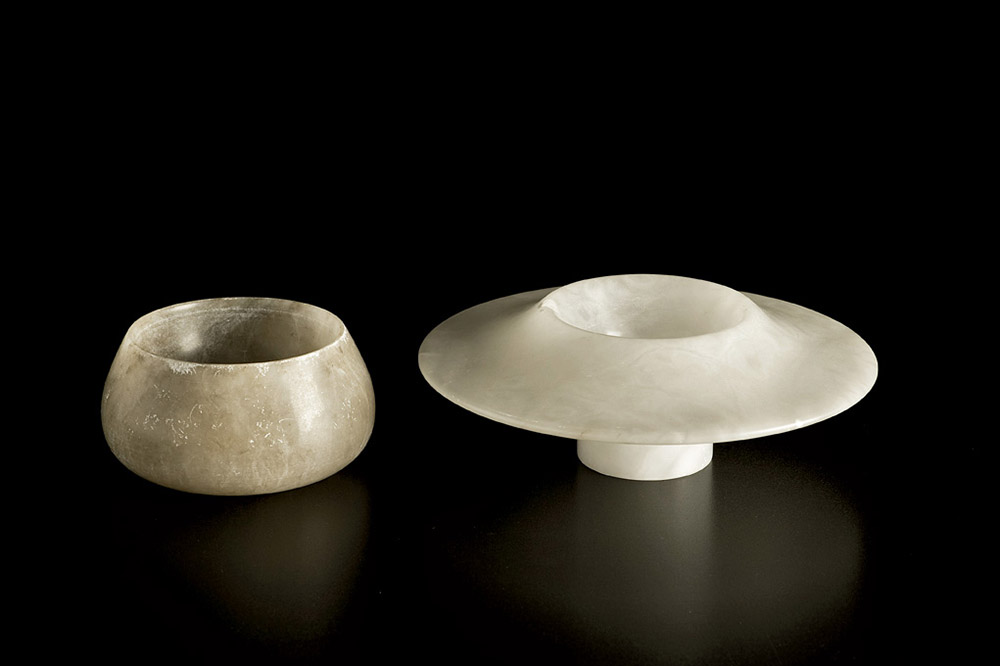 PICCOLO VASO E CENTROTAVOLA IN ALABASTRO, TORNITO E DISEGNATI PER LA SOCIETÀ COOPERATIVA ARTIERI DI VOLTERRA 1981. altezza vaso cm 6 e diametro centrotavola cm 20,5.