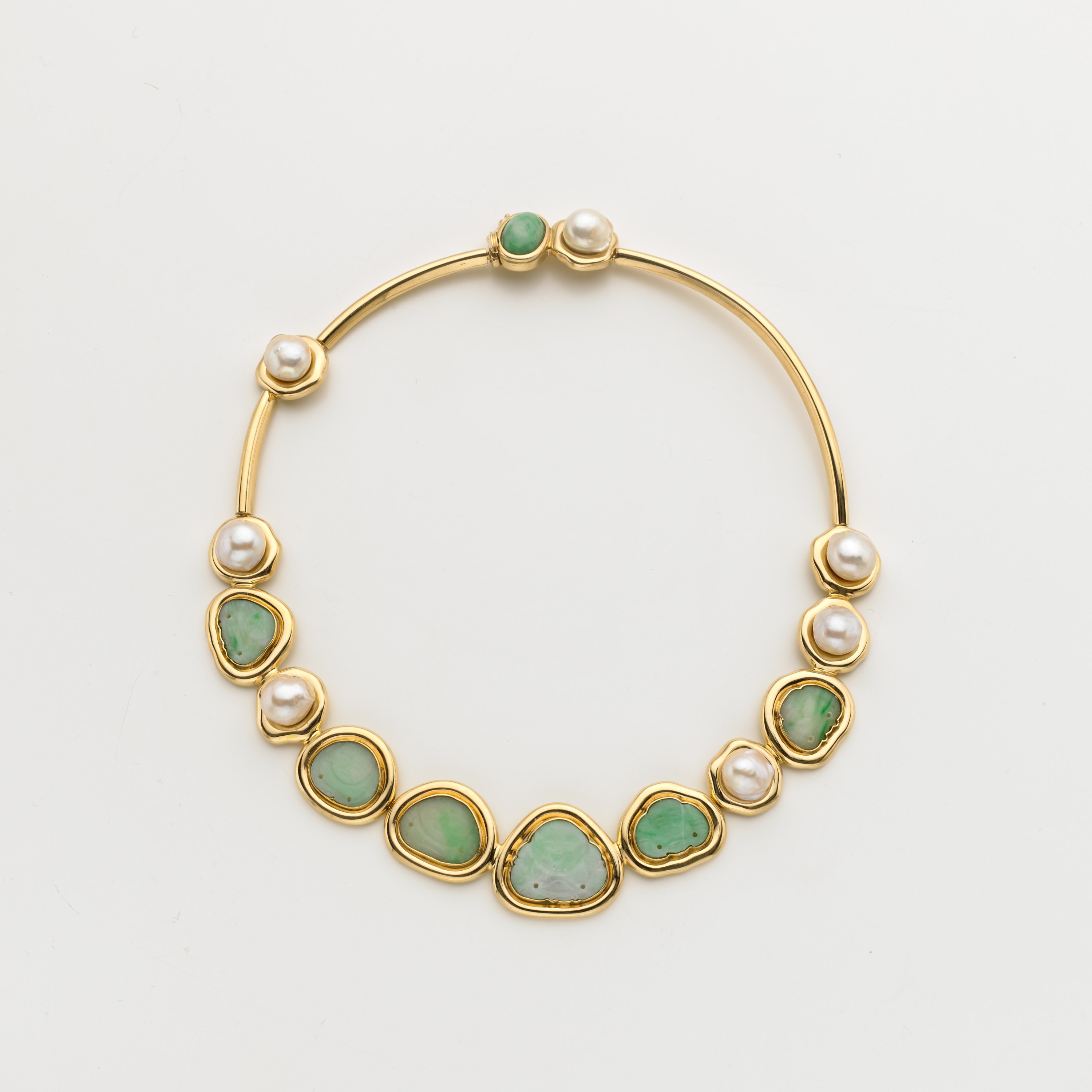 Collier semirigido in oro giallo con giade incise o cabochon e perle bianche...