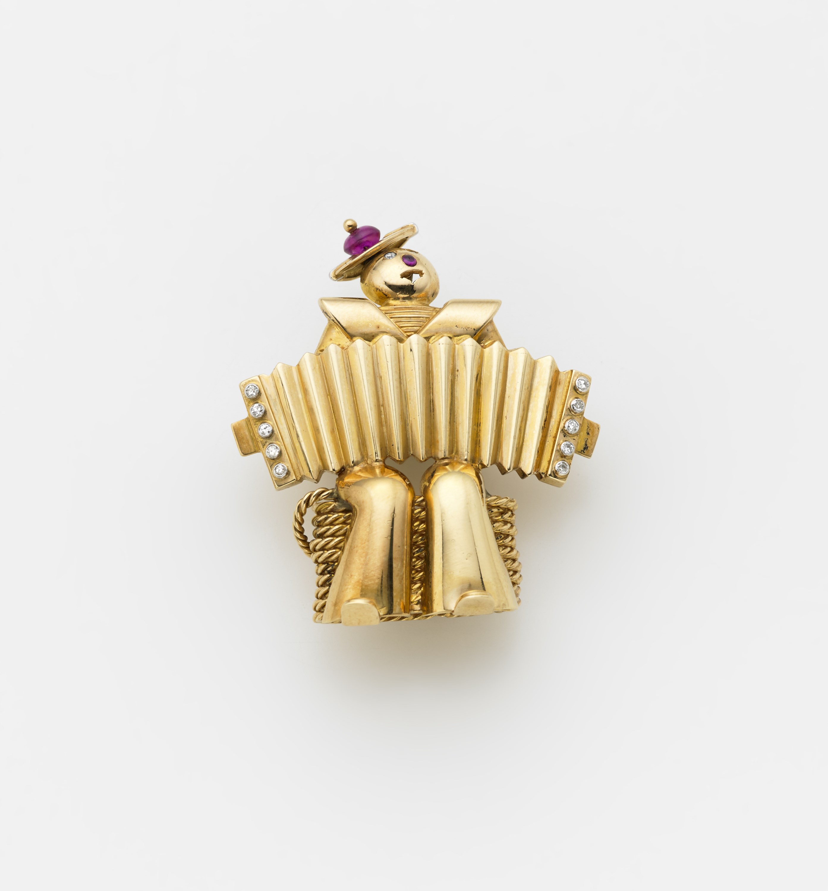 VAN CLEEF & ARPELS NY Spilla in oro giallo a guisa di suonatore di fisarmonica con piccoli diamanti e rubini g. 17,00 Diamond and ruby accordion player gold brooch