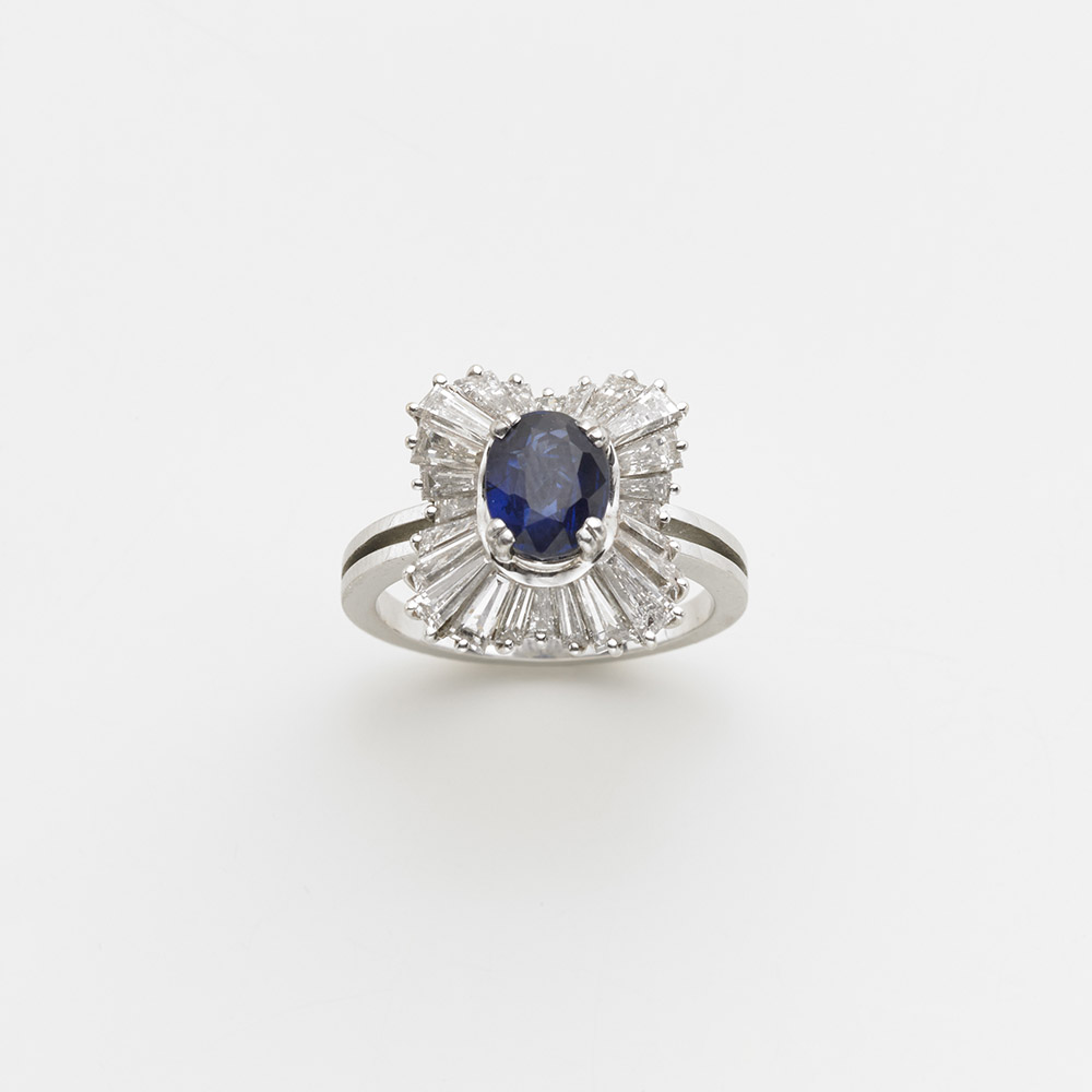 Anello in oro bianco con diamanti tappered a contornare uno zaffiro ovale...