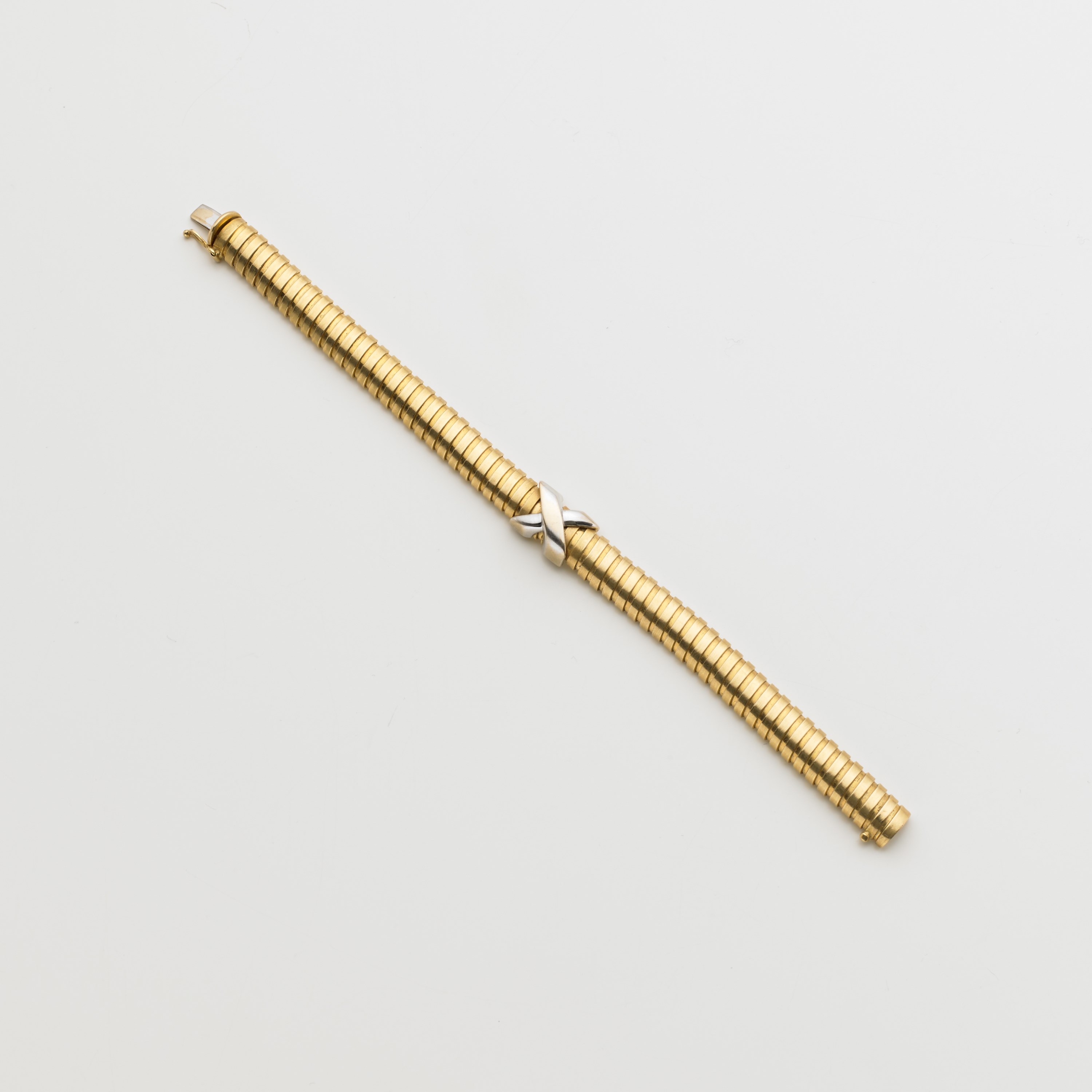 Bracciale tubogas in oro giallo con la centro una "X" in oro bianco lungh. cm 19 h cm 0,95 g. 20,30 (difetti di ammaccatura) A gold tubogas bracelet centered by a white-gold "X" (defects and dents)