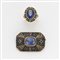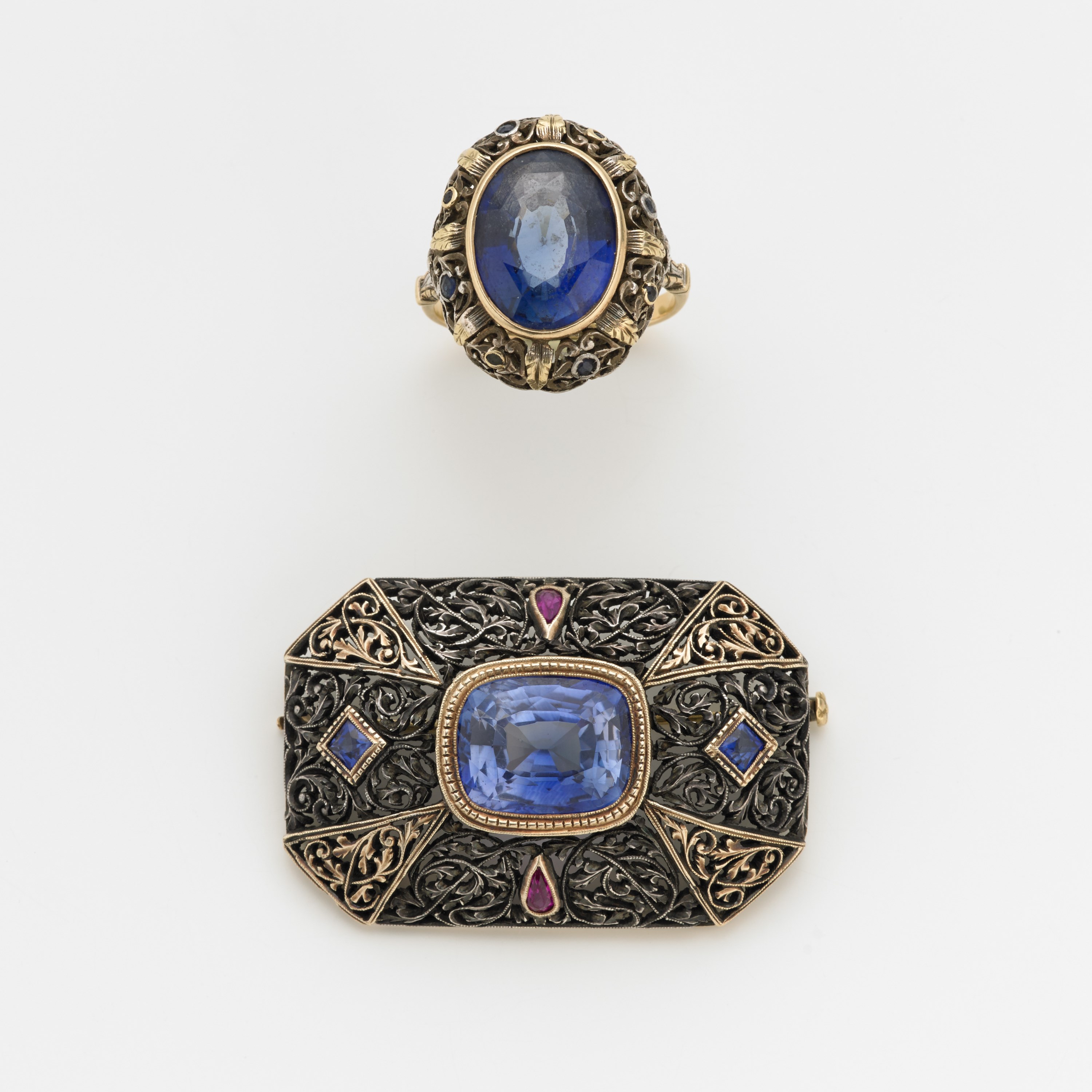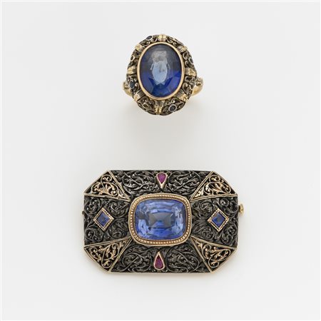Lotto composto da spilla ed anello in argento e oro con al centro due pietre di colore blu e altre varie, complessivi g. 21,40 misura 14/54 Lot comprising a silver and gold brooch and ring centered by various coloured stones