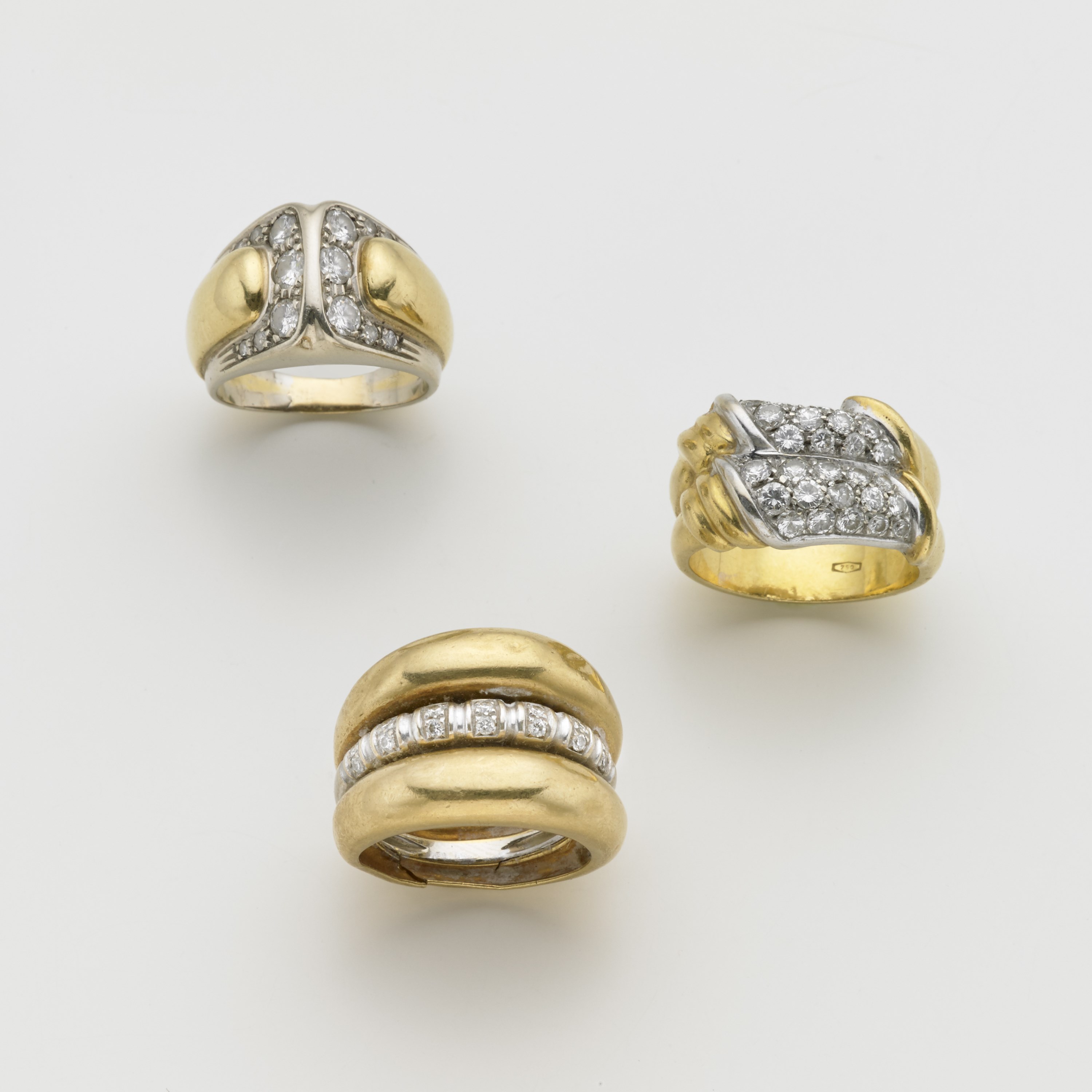 Lotto composto da tre anelli in oro giallo e bianco con diamanti rotondi taglio a brillante g. 31,80 misure diverse Lot comprising three different bi-coloured gold and diamond rings