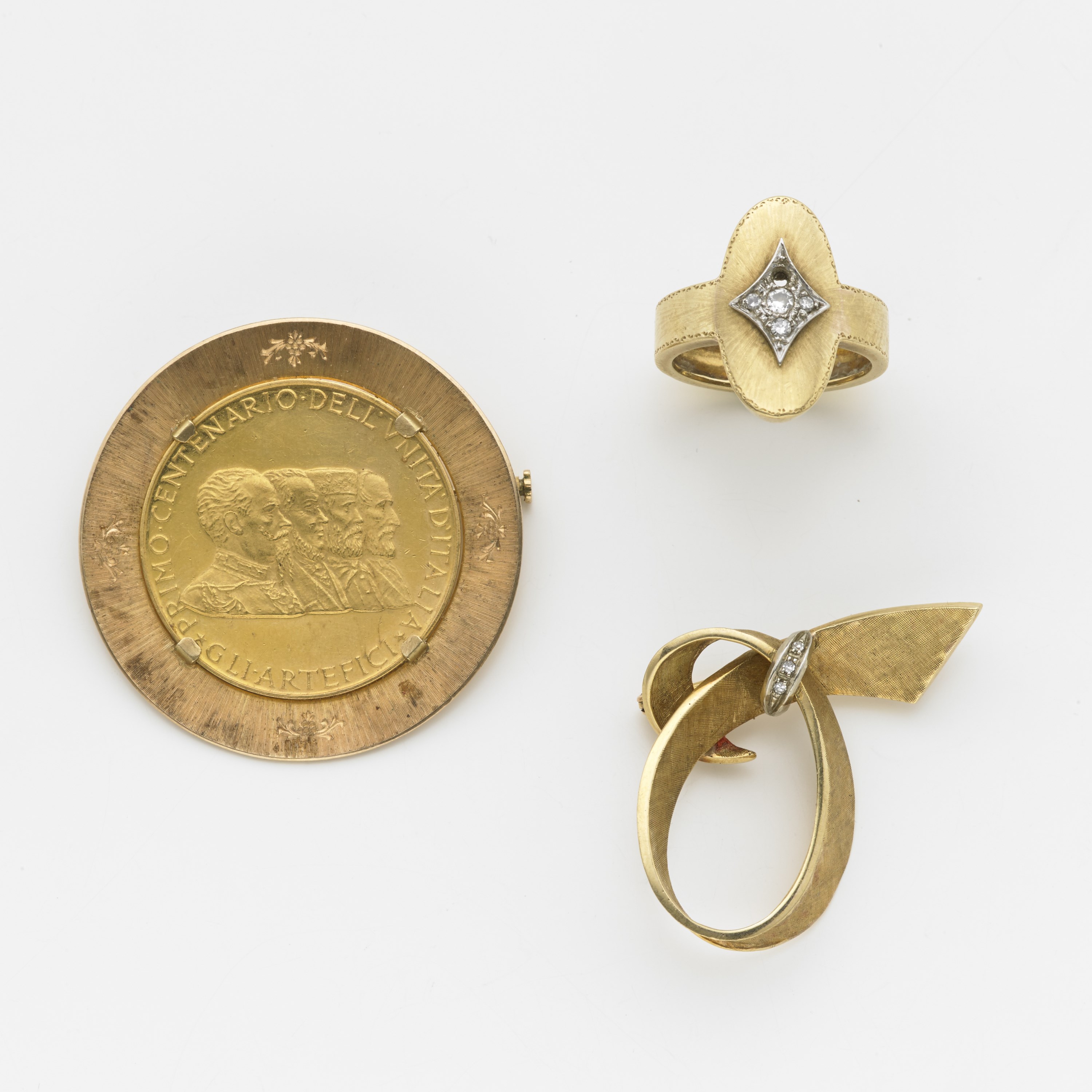 Lotto composto da anello e due spille in oro giallo satinato con diamanti, in una spilla una moneta d'oro del "Pirmo centenario dell'unit‡ d'Italia 1861-1961" (un diamante mancante nell'anello) complessivi g. 38,80 Lot comprising a ring and two brooches in gold and diamonds (one diamond deficient)