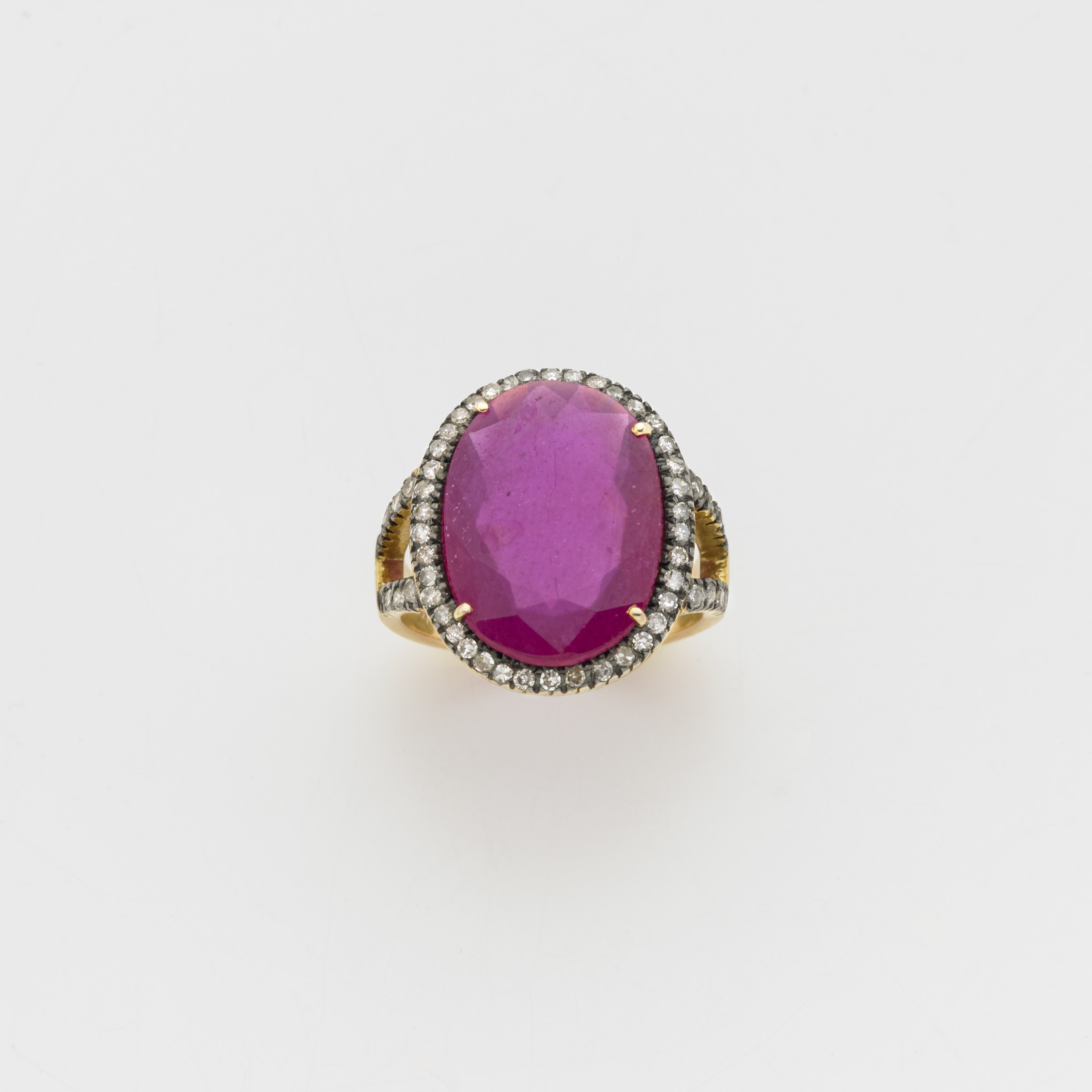 Anello in oro giallo e argento con diamanti rotondi ed al centro un rubino ovale di circa ct 12, g. 6,40, misura 12/52 Ruby single stone gold and silver ring with diamond surround