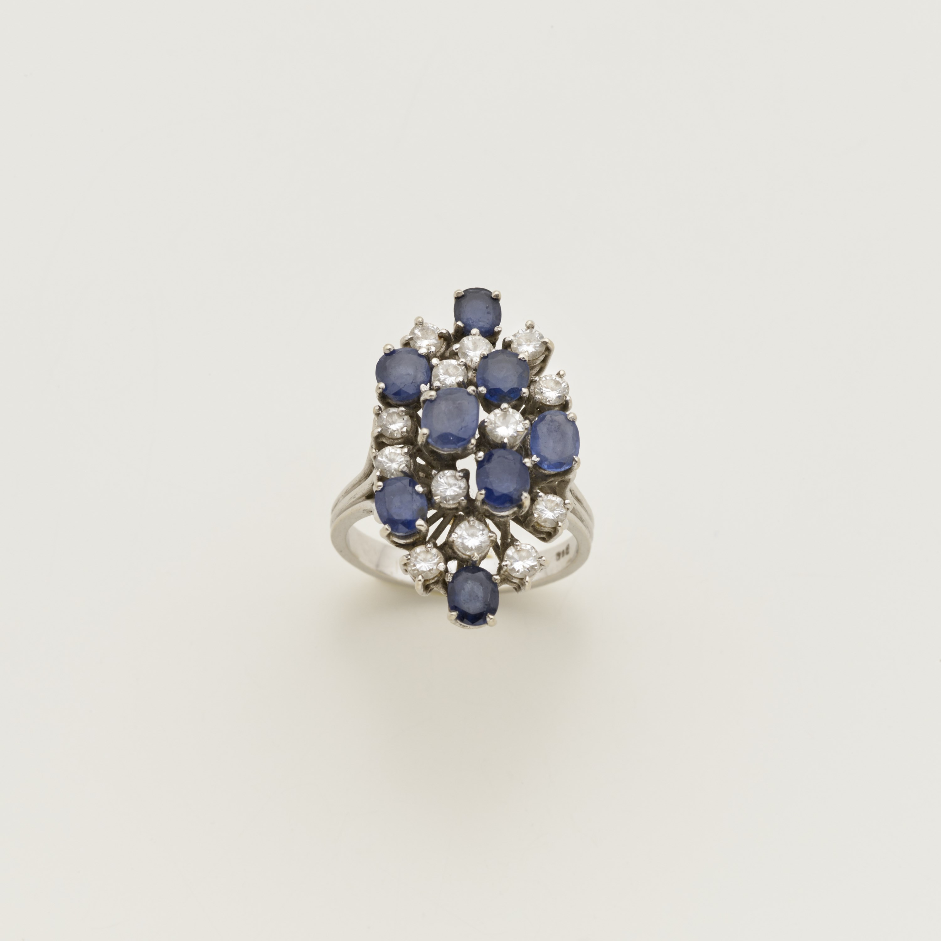 Lot 265 | Anello in oro bianco con diamanti rotondi e zaffiri ovali g. 8,20 misura...