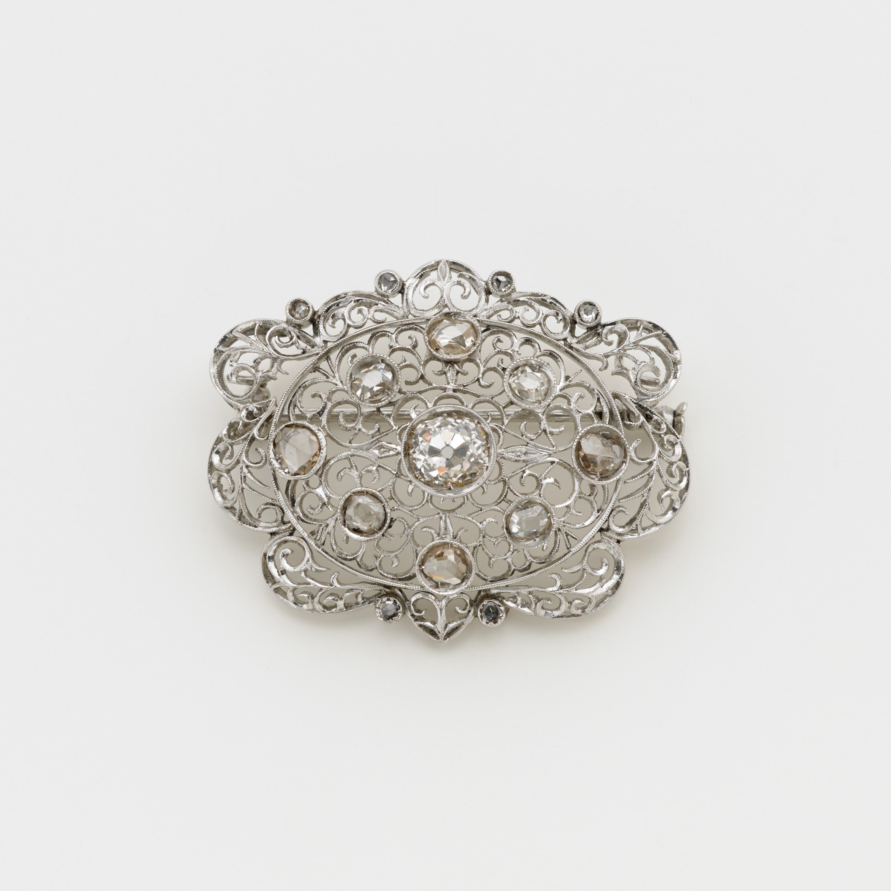 Spilla in oro bianco con diamanti irregolari taglio a mezza rosetta a...