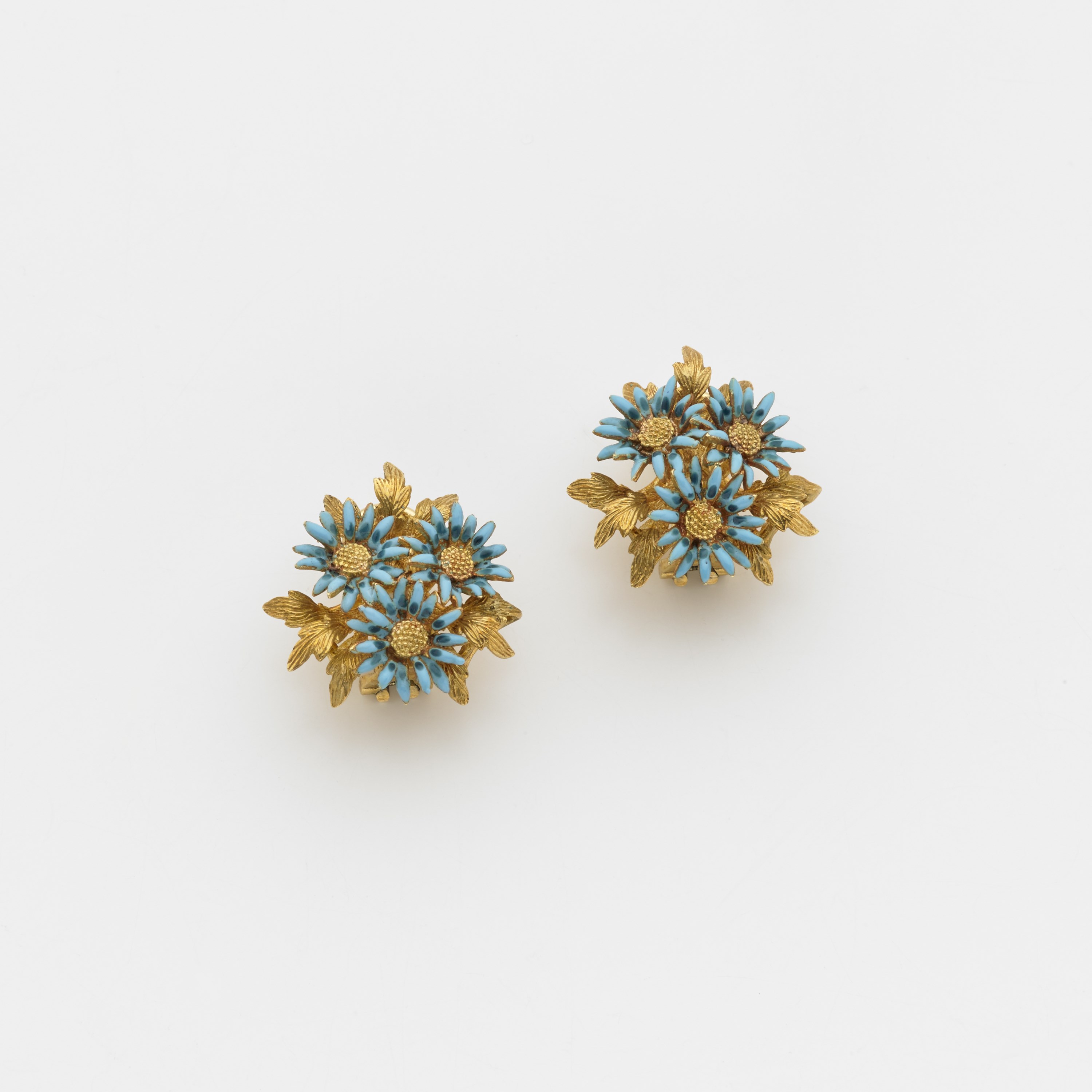 Orecchini a lobo con clips in oro giallo ognuno con tre fiori, petali smaltati di color turchese g. 19 Enamel and gold flower ear-clips