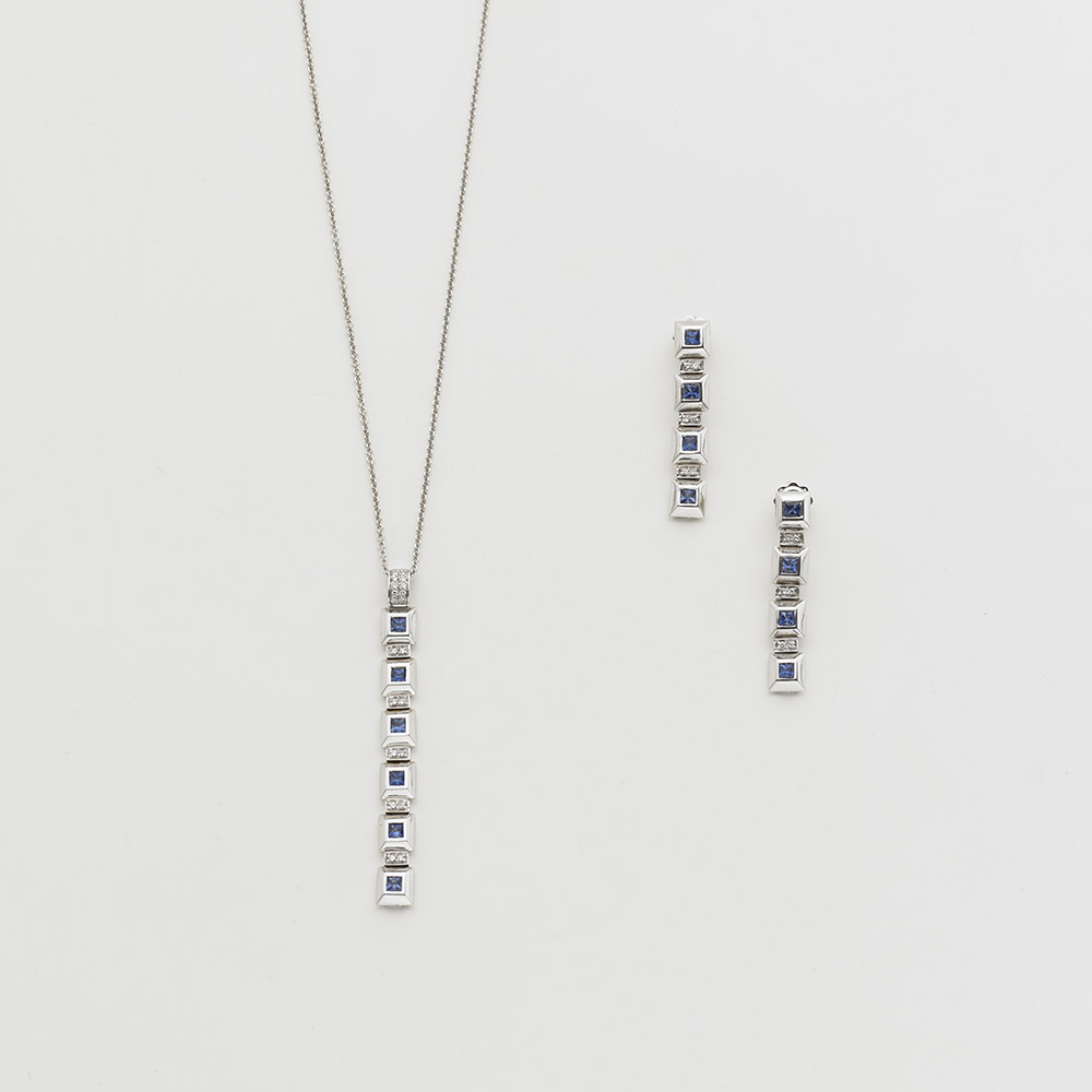HORPOS Demi-parure in oro bianco con zaffiri e diamanti composta da orecchini pendenti e ciondolo con catenina g.18,80 Sapphire and diamond white gold set of jewellery comprising a necklace with pendant and earings