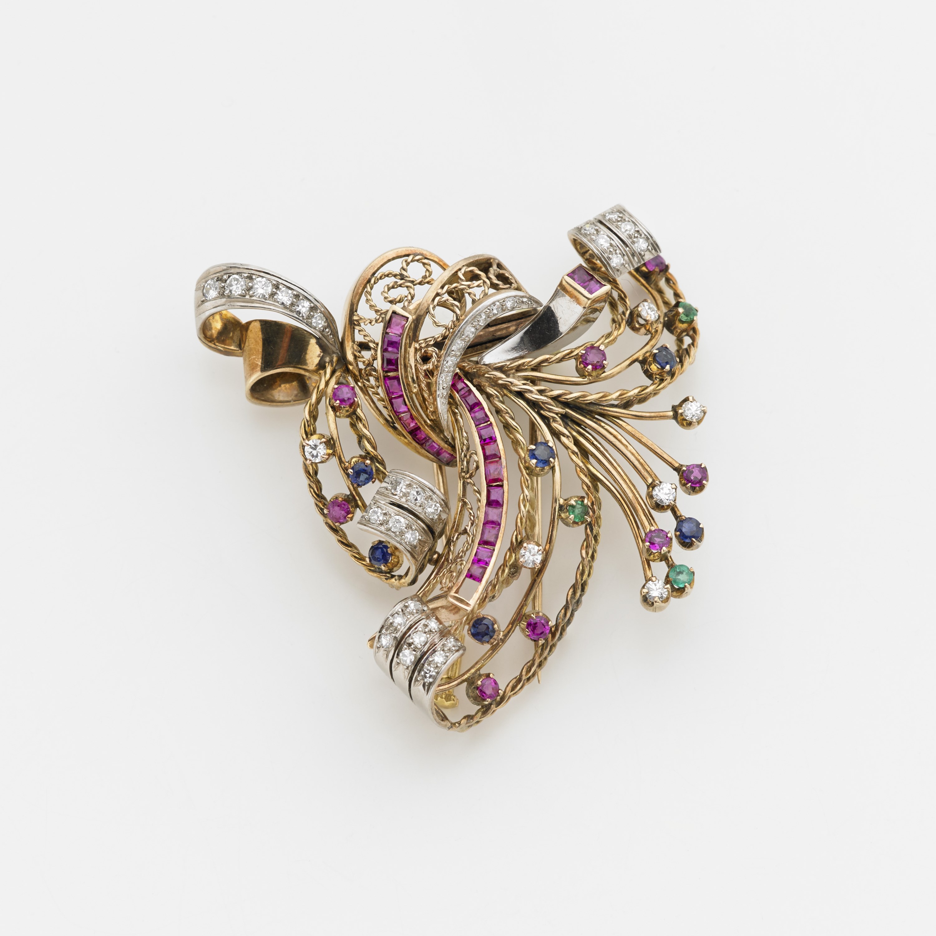Spilla in oro giallo e bianco con lavorazione liscia ed intrecciata diamanti, rubini, zaffiri e smeraldi g. 24,70 (rubino mancante) Bi-coloured gold brooch with diamonds, rubies, sapphires and emeralds (one ruby deficient)