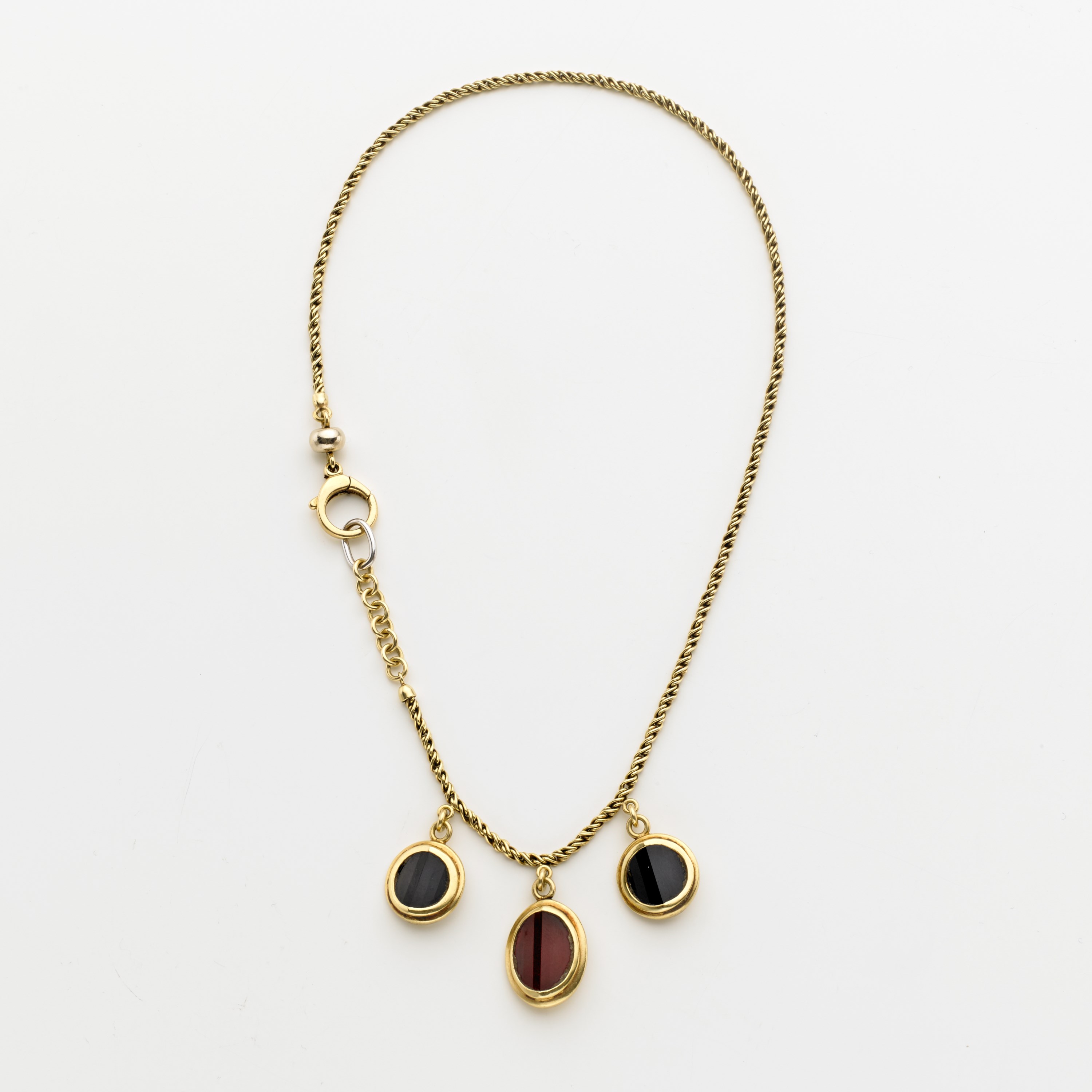 Collana in oro giallo e bianco con tre pendenti in onice e corniola lungh. cm 42, g. 41,40 Bi-coloured gold necklace with three onyx and carnelian pendants