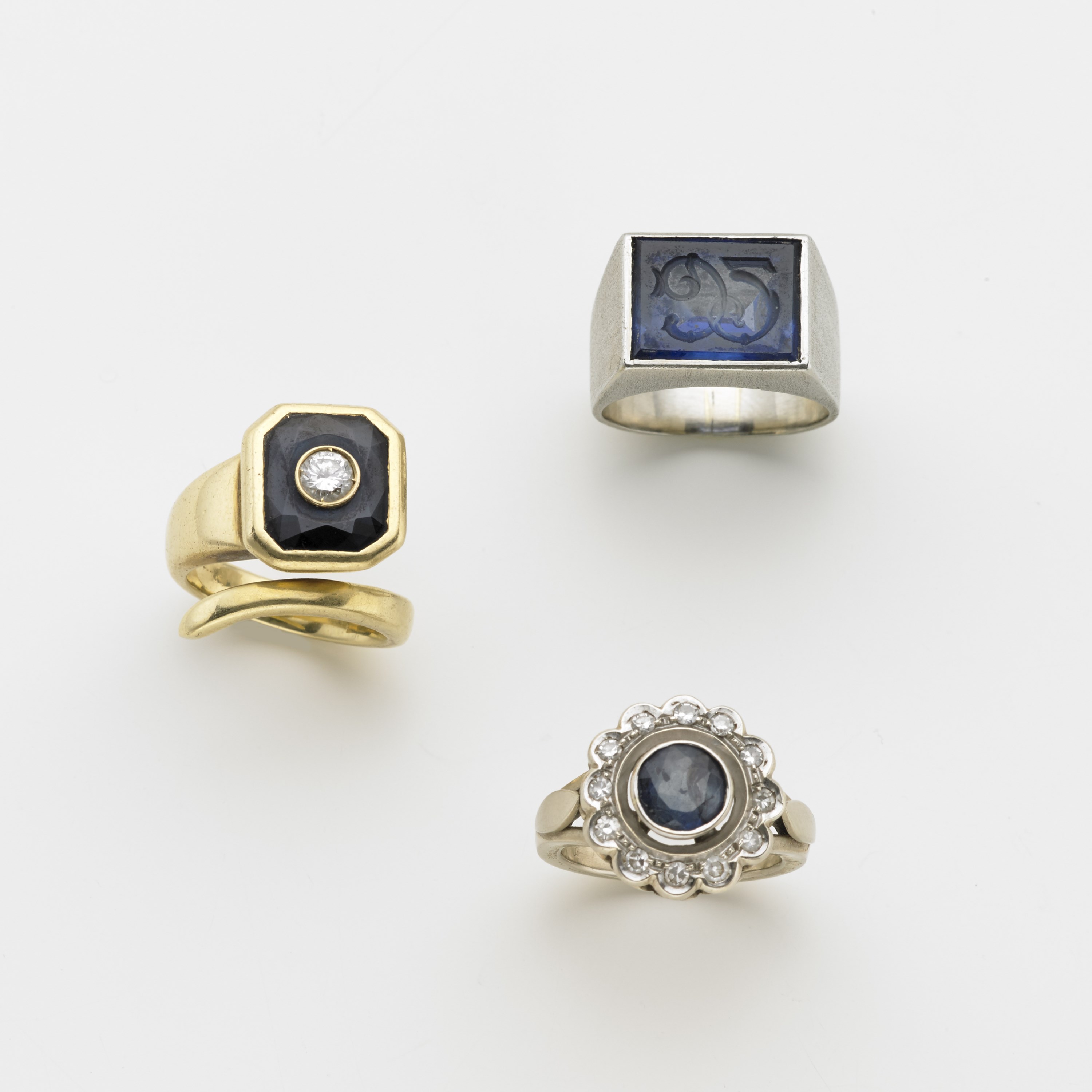Tre anelli uno in oro giallo e bianco con pasta vitrea blu incisa, un altro con zaffiro contornato da diamanti e l'ultimo con diamante incastonato in una pietra blu, misure varie complessivi g. 28,60 Lot comprising three different gold rings