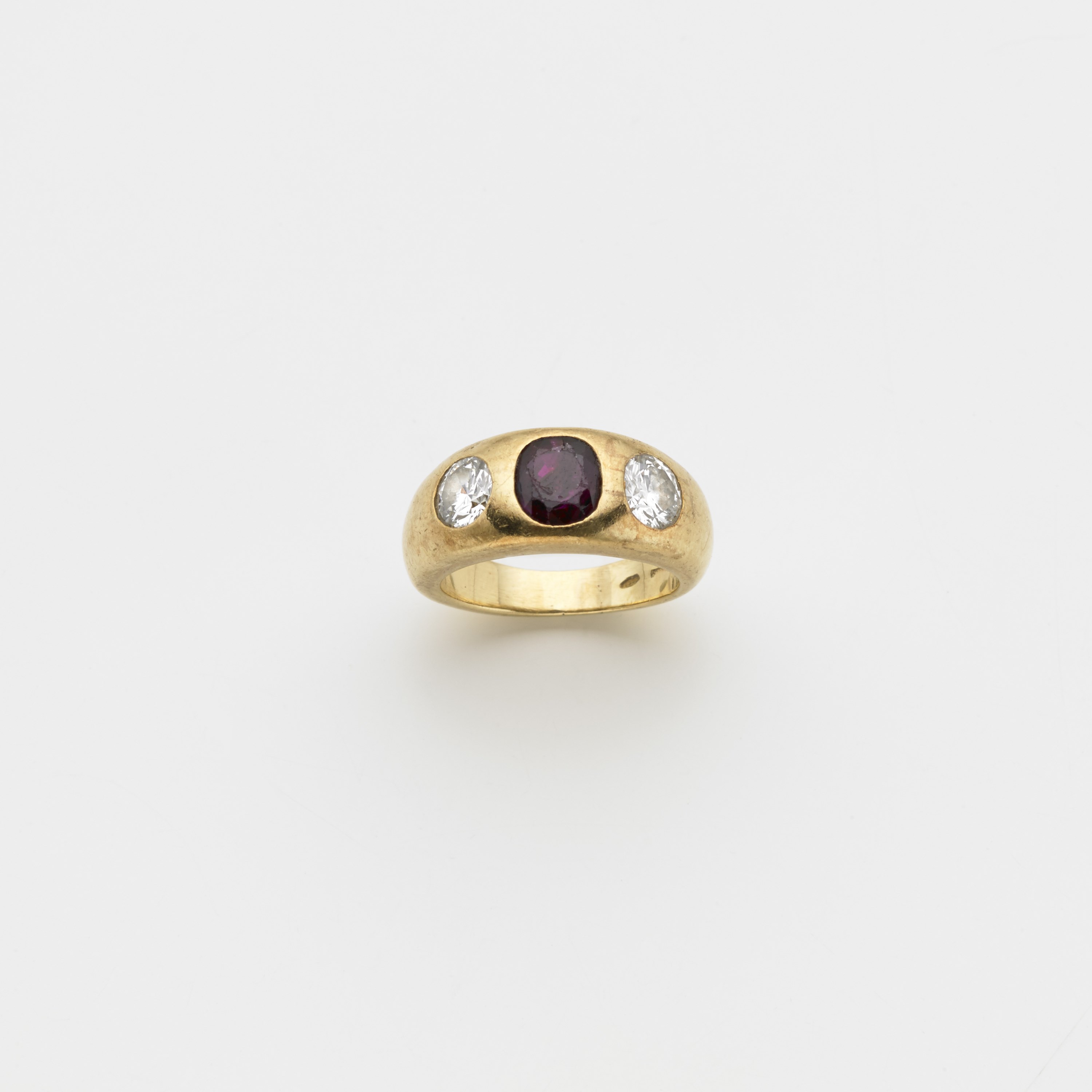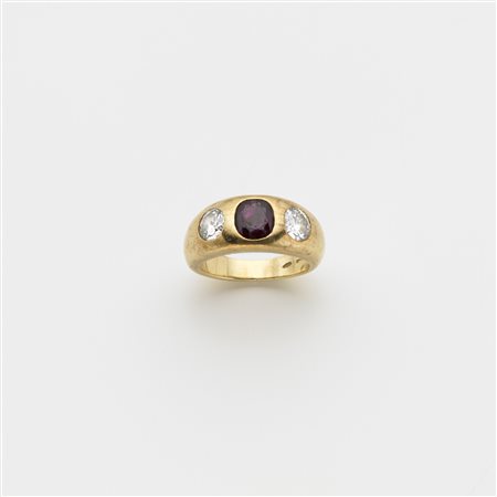 Anello in oro giallo con al centro un rubino ovale taglio composito e due diamanti rotondi taglio a brillante di ct 0,50 l'uno circa g. 9,60 misura 10/50 Gold band ring centered by a ruby and two diamonds