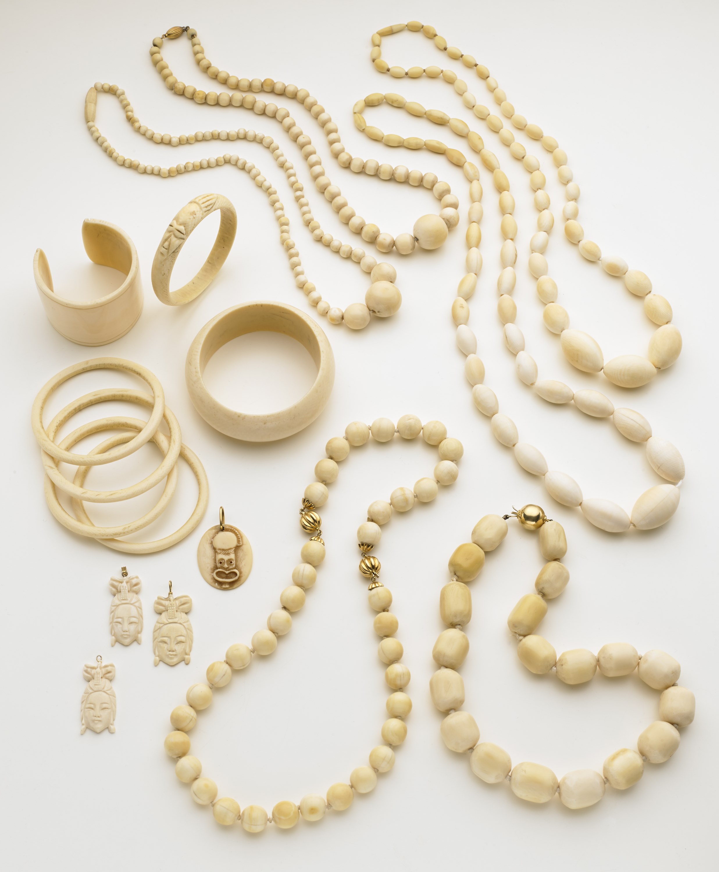Lotto di avorio composto da: due collane ovaloidi a scalare, due con boules rotonde e grande boule centrale, una a barilotti, una boules con bracciale, sette bracciali rigidi di cui uno alla schiava e quattro ciondoli. Tutte le rifiniture in oro complessivi g. 714 Ivory lot comprising five necklaces plus one with bracelet, seven bangles, and four pendants. Gold trimmings