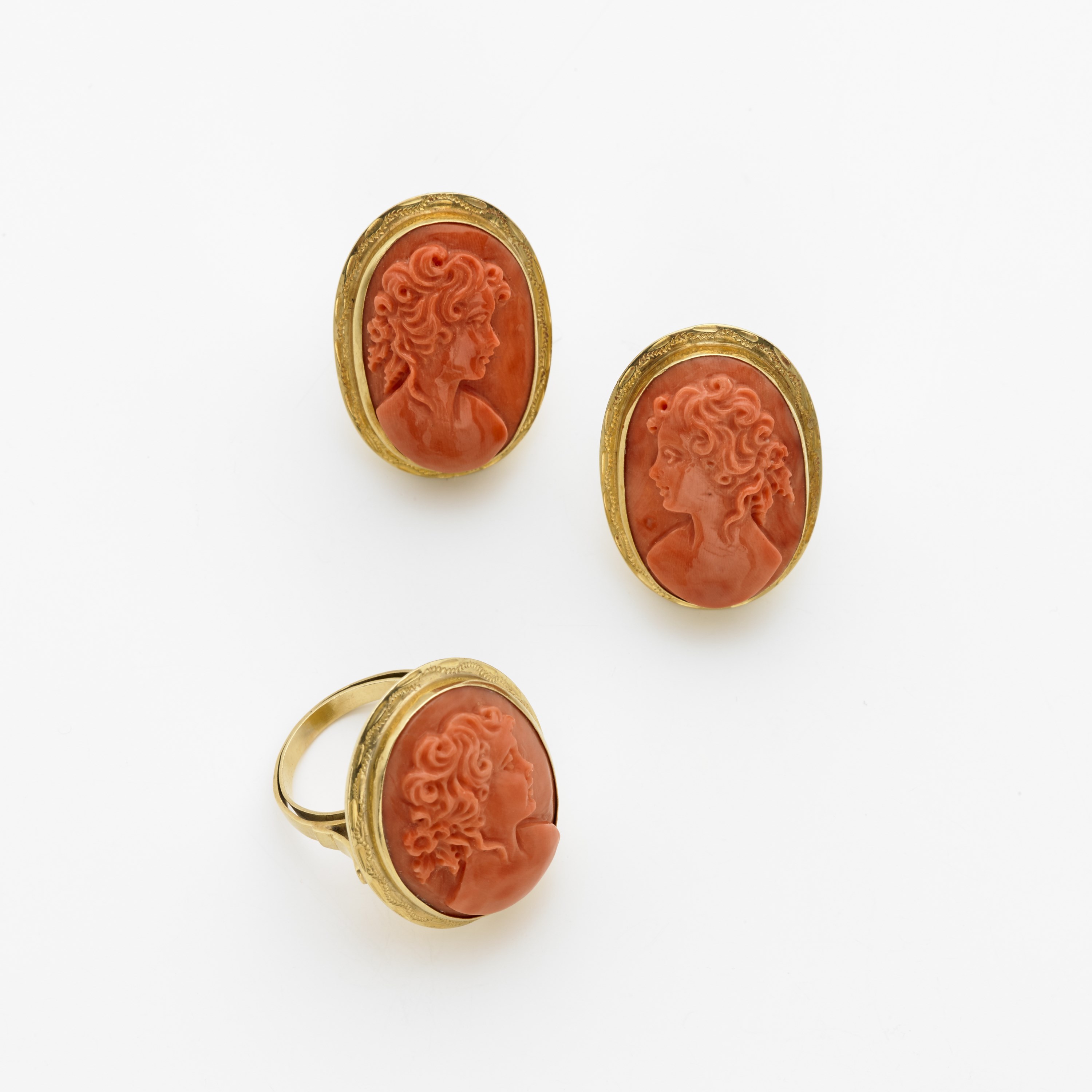Demi-parure in oro giallo con anello ed orecchini con ovali in corallo arancione inciso con profilo di donna g. 37,10 misura anello 14/54 Gold and coral demi-parure comprising a ring and a pair of earings