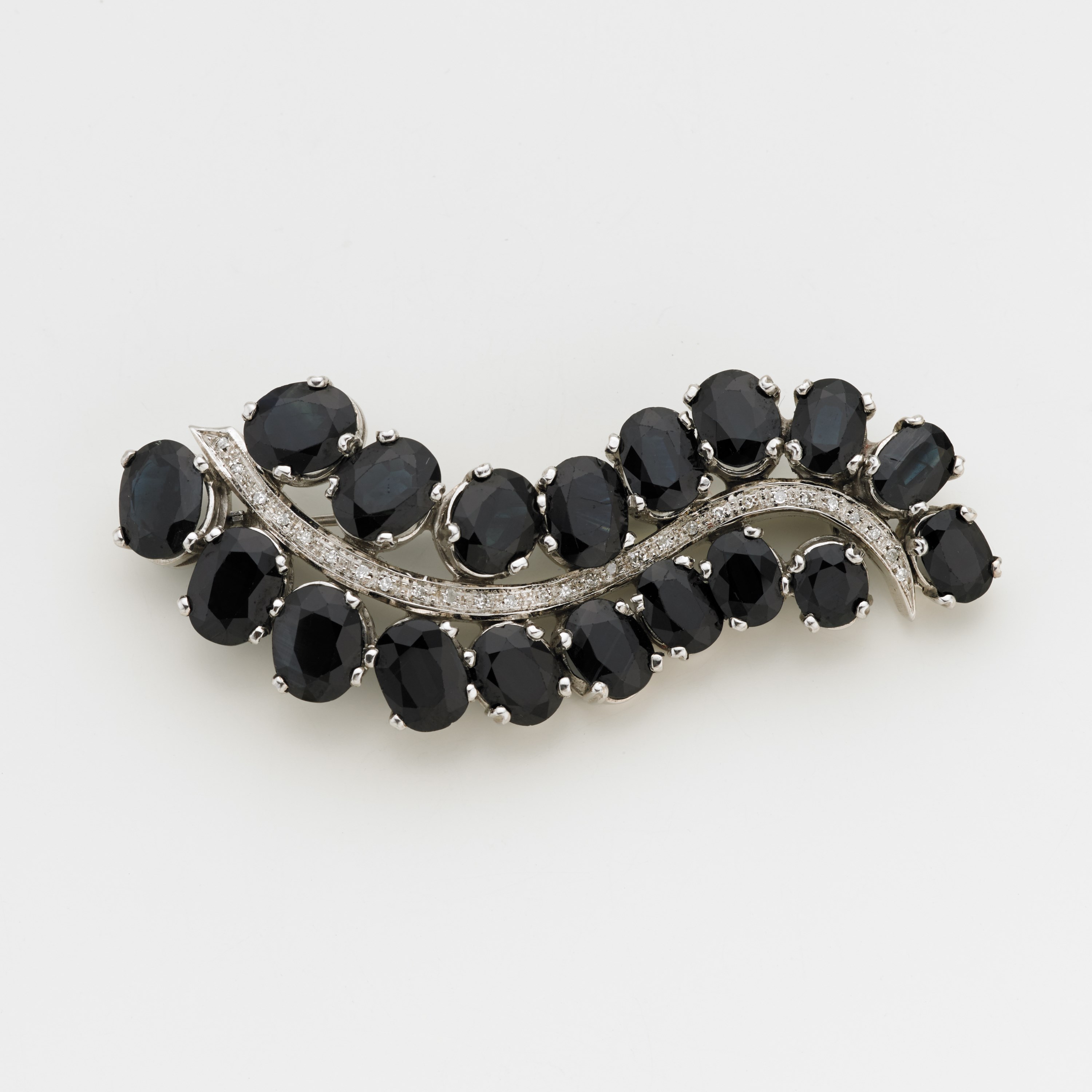 Spilla a guisa di foglia in oro bianco con zaffiri ovali e nervatura centrale ornata da piccoli diamanti, g. 24,70, lungh. cm 6,5 Sapphire and diamond white gold brooch