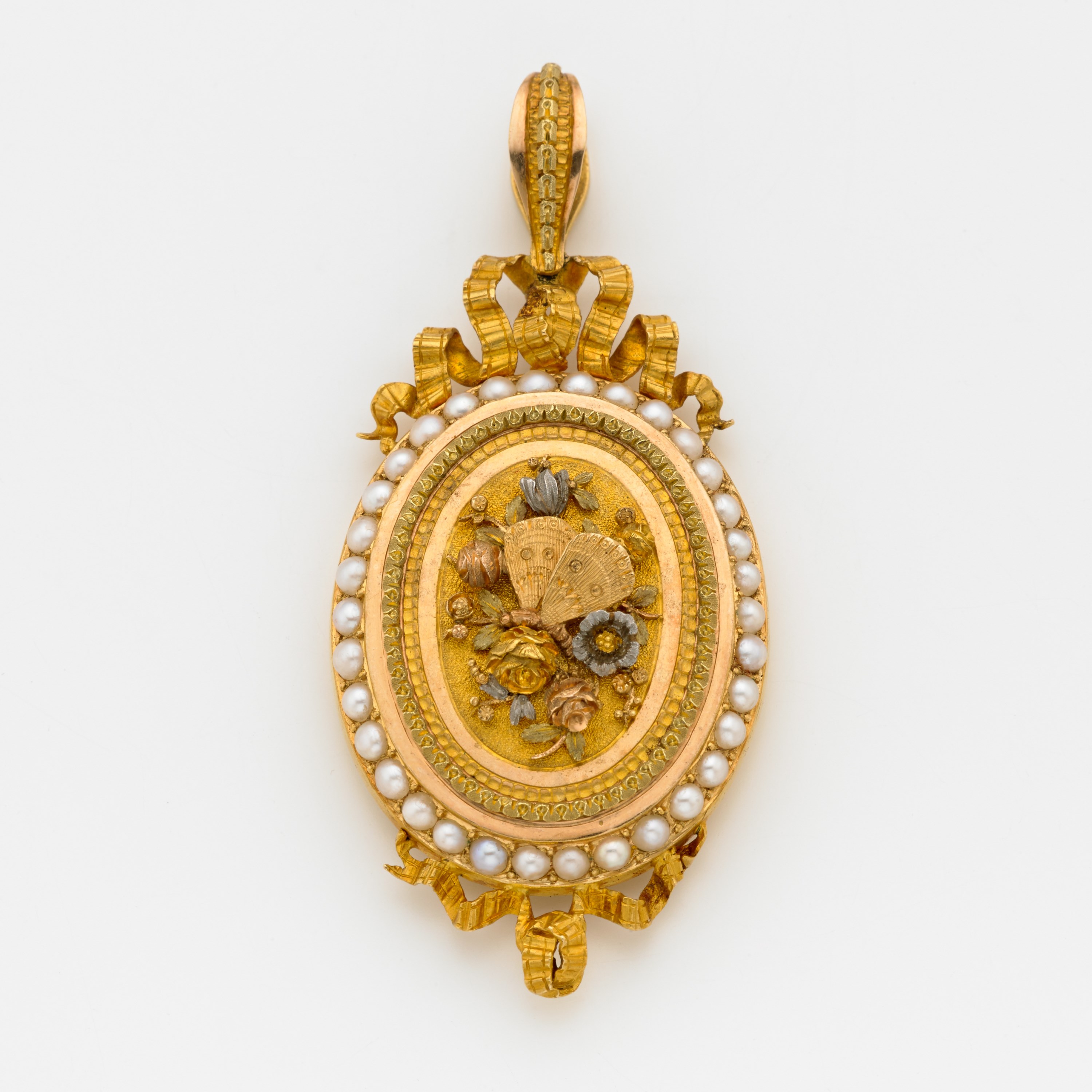 Ciondolo in oro giallo con lavorazione a rilievo di rose e farfalle in oro bianco, giallo e rosso contorno di mezze perle bianche; apribile con all'interno portacapelli in vetro. Francia numero di serie 344 g. 22,5 Sculpted gold locket with half pearl surround. France series 344