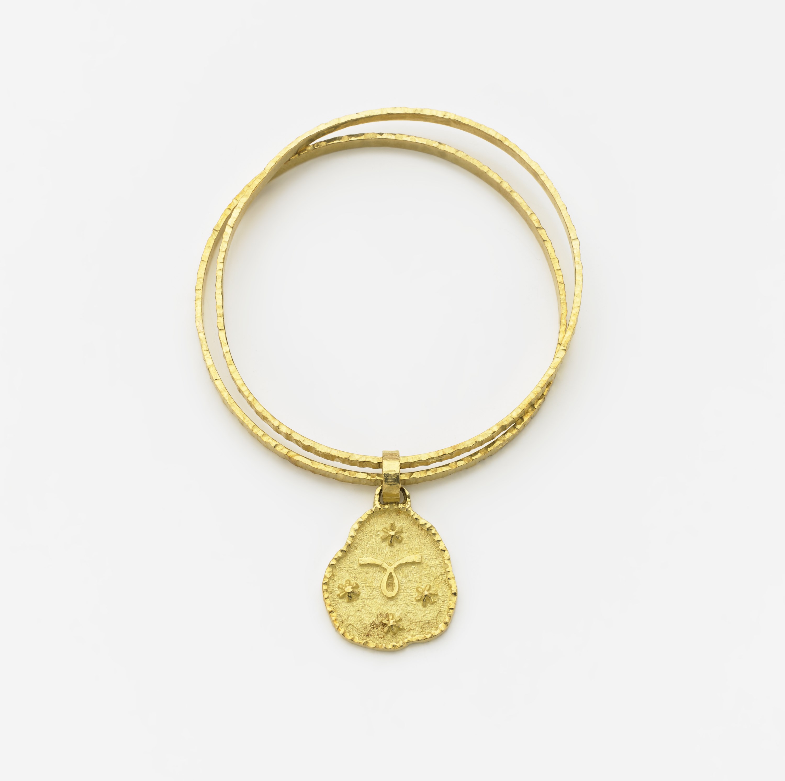 Due bracciali rigidi con charm/medaglia in oro giallo battuto lucido e...
