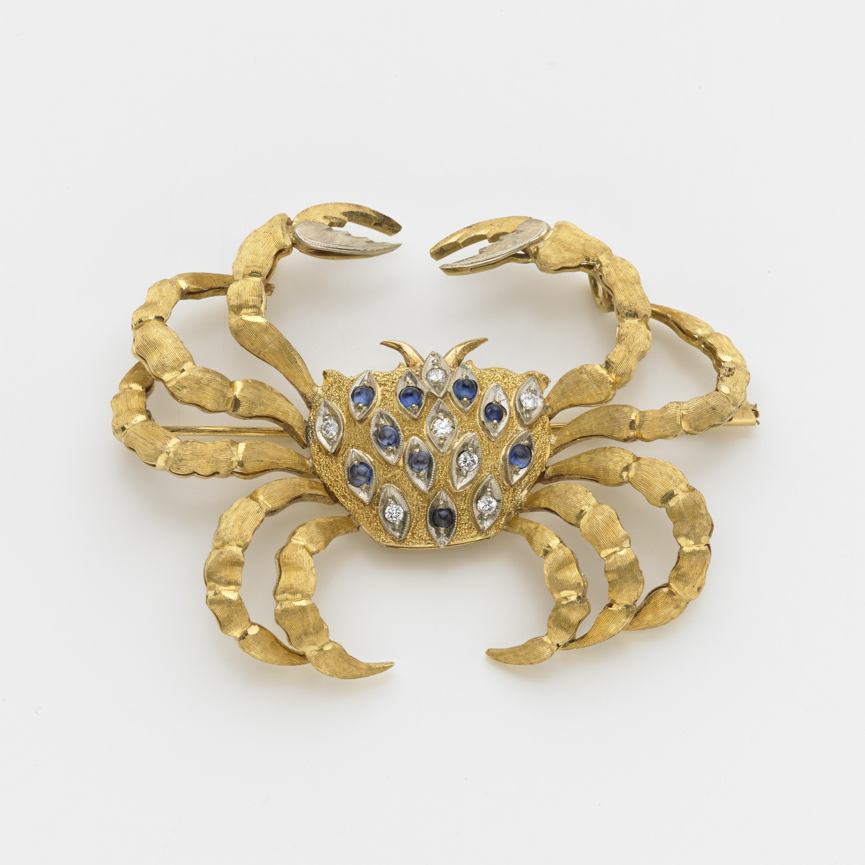 Spilla a forma di granchio in oro giallo e bianco con piccoli diamanti rotondi e zaffiri cabochon,g.32,70 Diamond and sapphire gold crab brooch