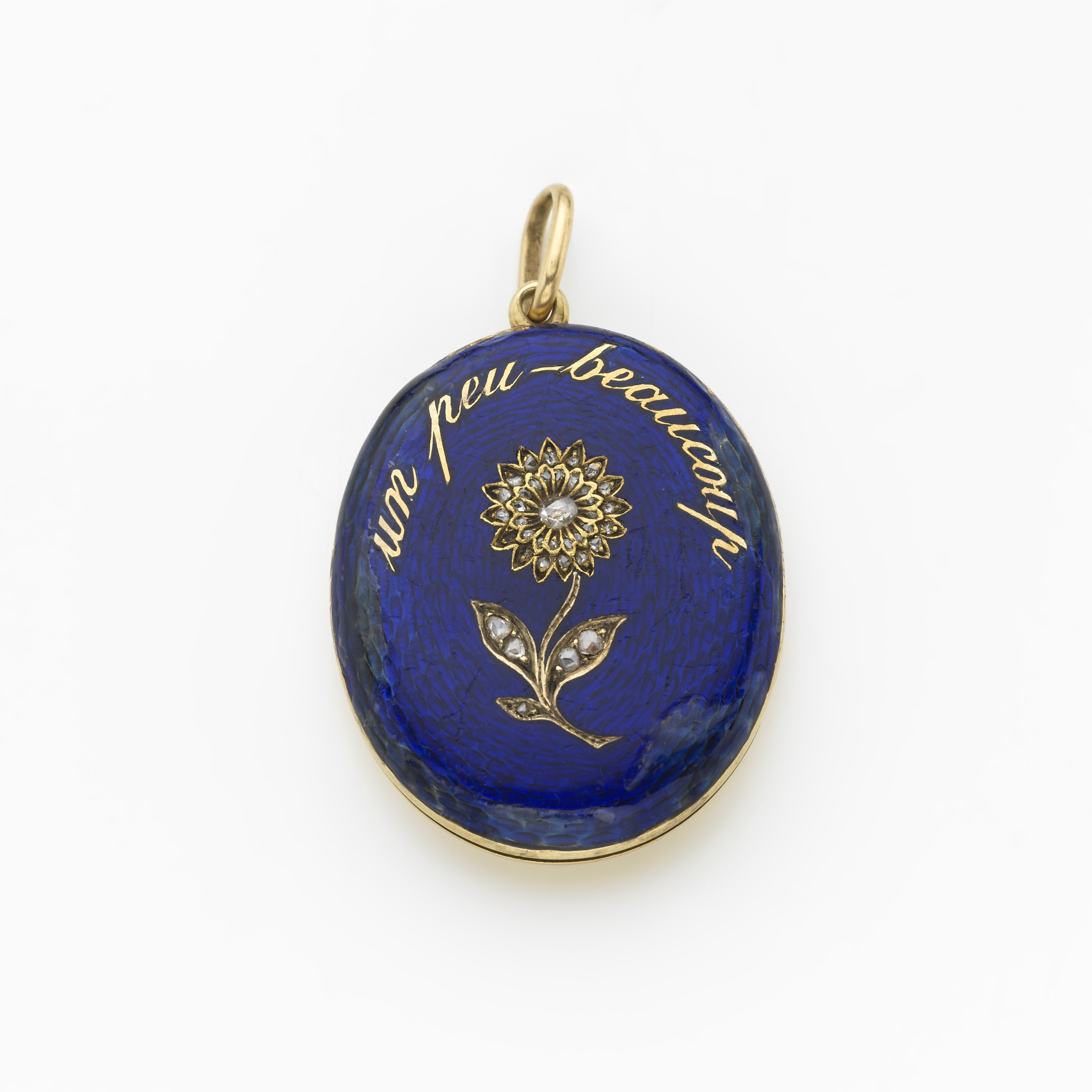 Portafoto ovale, da un lato una margherita incisa con diamanti su smalto blu, dall'altro incisione "Souvenir de grande mËre ‡ Emile 30 Fbre 1870" g. 10,80 Prov.: nonna materna C.ssa Antonietta Caterina Vimercati Sanseverino nata Rossi Martini Oval frame with diamond and blue enamel daisy insribed with "Souvenir de grande mËre ‡ Emile 30 Fbre 1870" Provenance: grandmother Countess Antonietta Caterina Vimercati Sanseverino born Rossi Martini