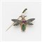 Broche a forma di libellula, in oro giallo e argento, trasformabile in spillone, con diamanti irregolari, taglio a mezza rosetta, una perla mm 6-6,5, smeraldi e rubino. g. 21,20 Prov.: bisnonna materna Contessa Emilia Martini Giovio della Torre Multi-gem gold and silver dragonfly brooch Provenance: great grandmother Countess Emilia Martini Giovio della Torre