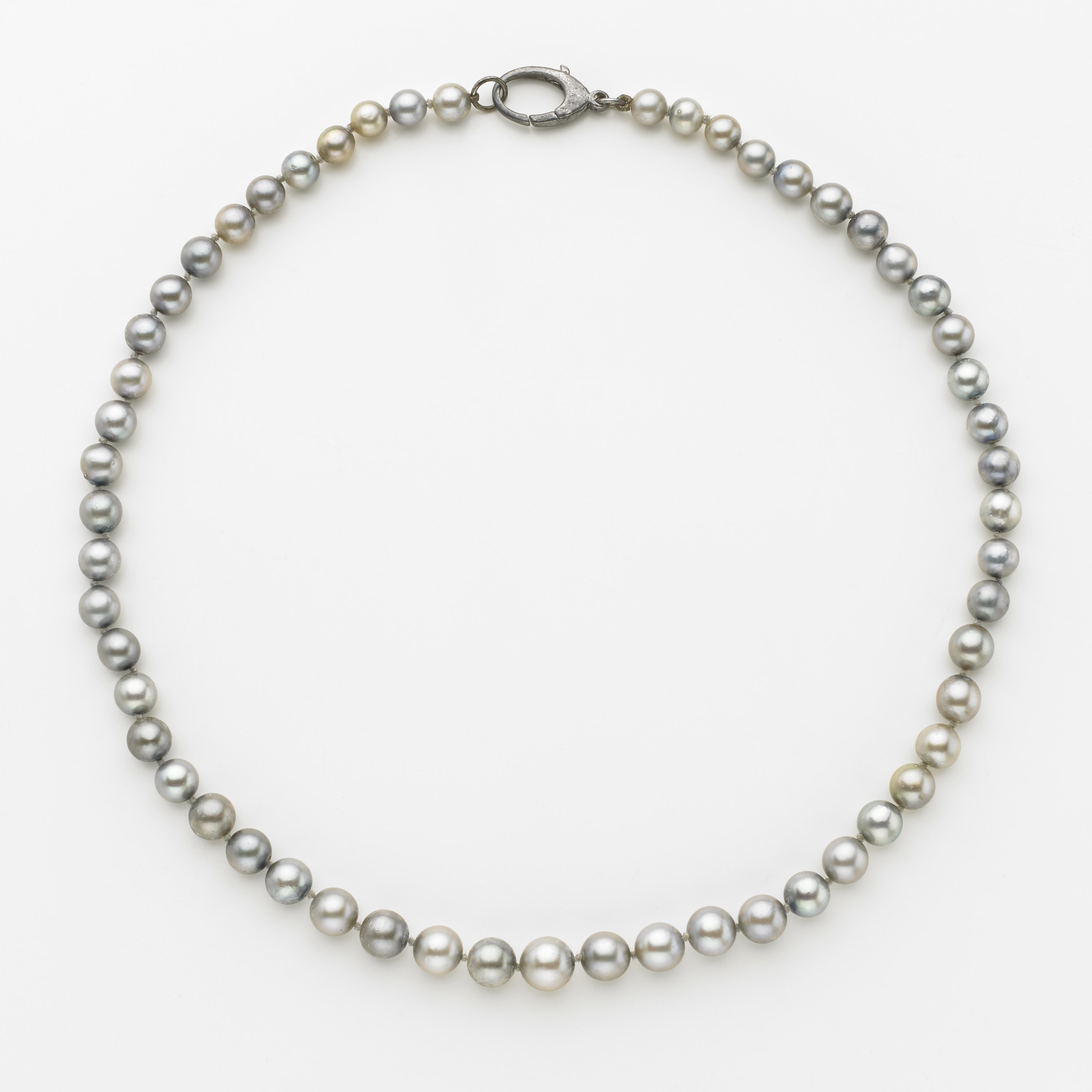 Filo di perle grige da mm 7 a mm 11 con in chiusura metallo g. 42,80 lungh. cm 53 Prov.: nonna materna Contessa Antonietta Caterina Vimercati Sanseverino, nata Rossi Martini Single strand grey pearls with metal clasp Provenance: grandmother Countess Antonietta Caterina Vimercati Sanseverino, born Rossi Martini