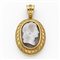Pendente in oro giallo, con lavorazione a cerchi di filigrana a contornare un cammeo ovale con profilo di dama, g. 11,60. Prov.: trisavola materna C.ssa Emilia Martini Giovio della Torre sposata C.ssa Taverna di Landriano Oval cameo and gold pendant Provenance: great-grandmother Countess Emilia Martini Giovio della Torre married Countess Taverna di Landriano