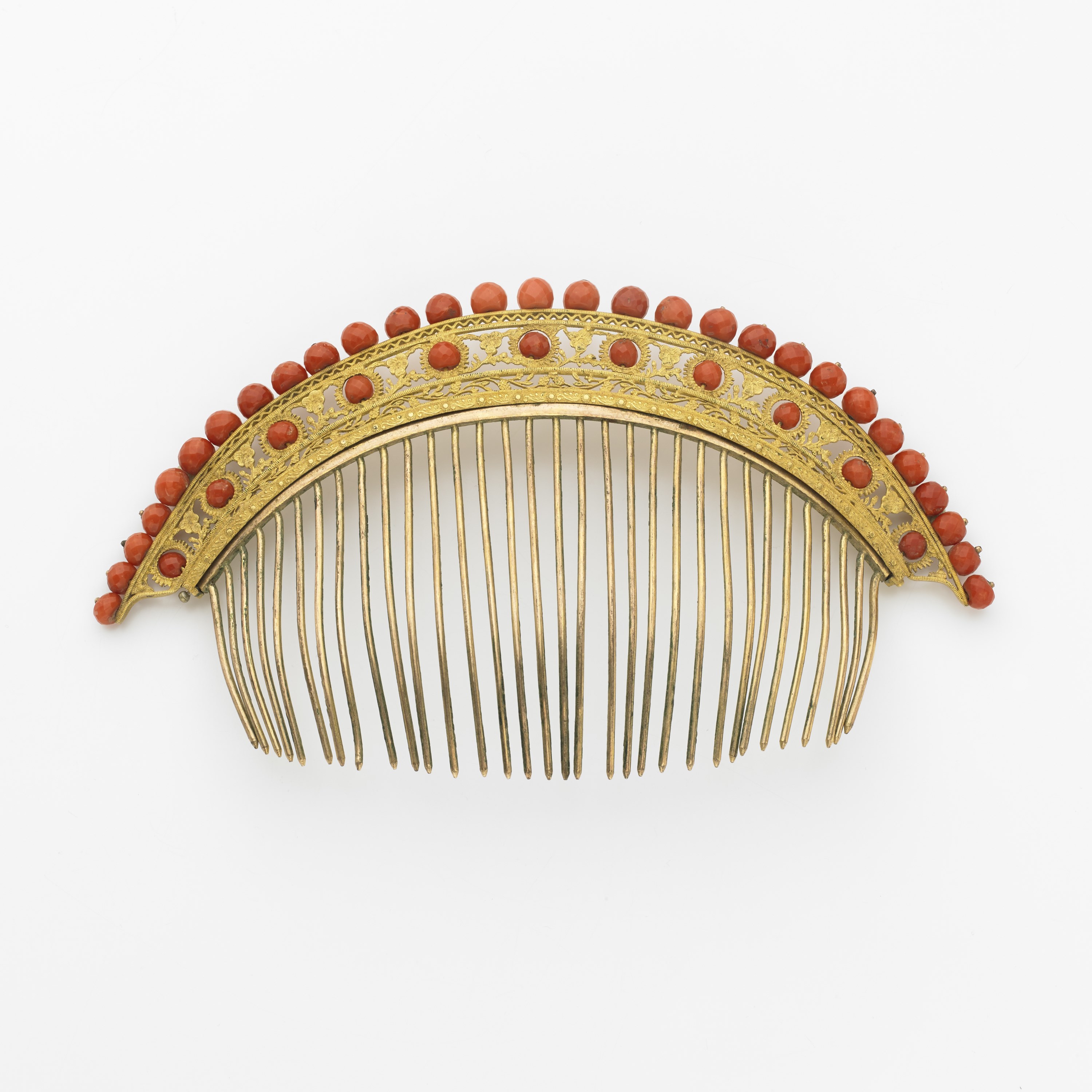 Pettine a tiara per acconciatura in oro giallo e 41 coralli tondi e/o a bauletto sfaccettati e scalati da mm 8 a 7, g. 38,80 complessivi di pettine in metallo (difetti) Prov.: quadrisavola materna Margherita Ruga nata Tealdi detta "la Rugabella" e cantata da Stendhal per la sua bellezza leggendaria Metal and coral ornamental comb (defects) Provenance: great grandmother Margherita Ruga born Tealdi known as "la Rugabella"