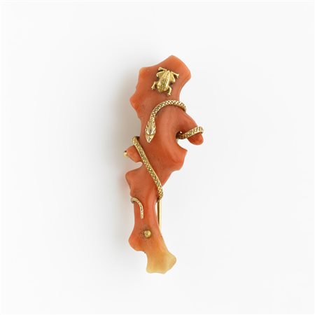 Spilla/ciondolo in ramo di corallo rosa/arancio, con serpente e ranocchia in oro giallo g. 6,60 Prov.: bisnonna materna Contessa Emilia Martini Giovio della Torre Pink-orange coral and gold pendant brooch Provenance grandmother Countess Emilia Martini Giovio della Torre