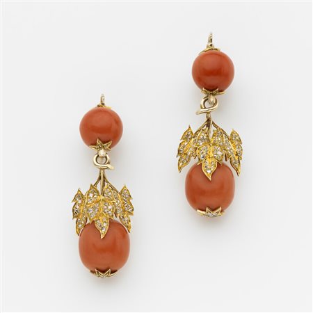 Orecchini pendenti in oro giallo, con parte inferiore smontabile, a quattro boules di corallo arancio, di cui due sfere di mm 12,5-13,0 e due ovali di mm 14,50-16,50, diamanti forma irregolare, taglio a mezza rosetta, g. 28,00 Prov.: trisavola materna C.ssa Emilia Martini Giovio della Torre sposata C.ssa Taverna di Landriano Orange coral and diamond gold earings, detachable lower part Provenance: great aunt Countess Emilia Martini Giovio della Torre married Countess Taverna Landriano