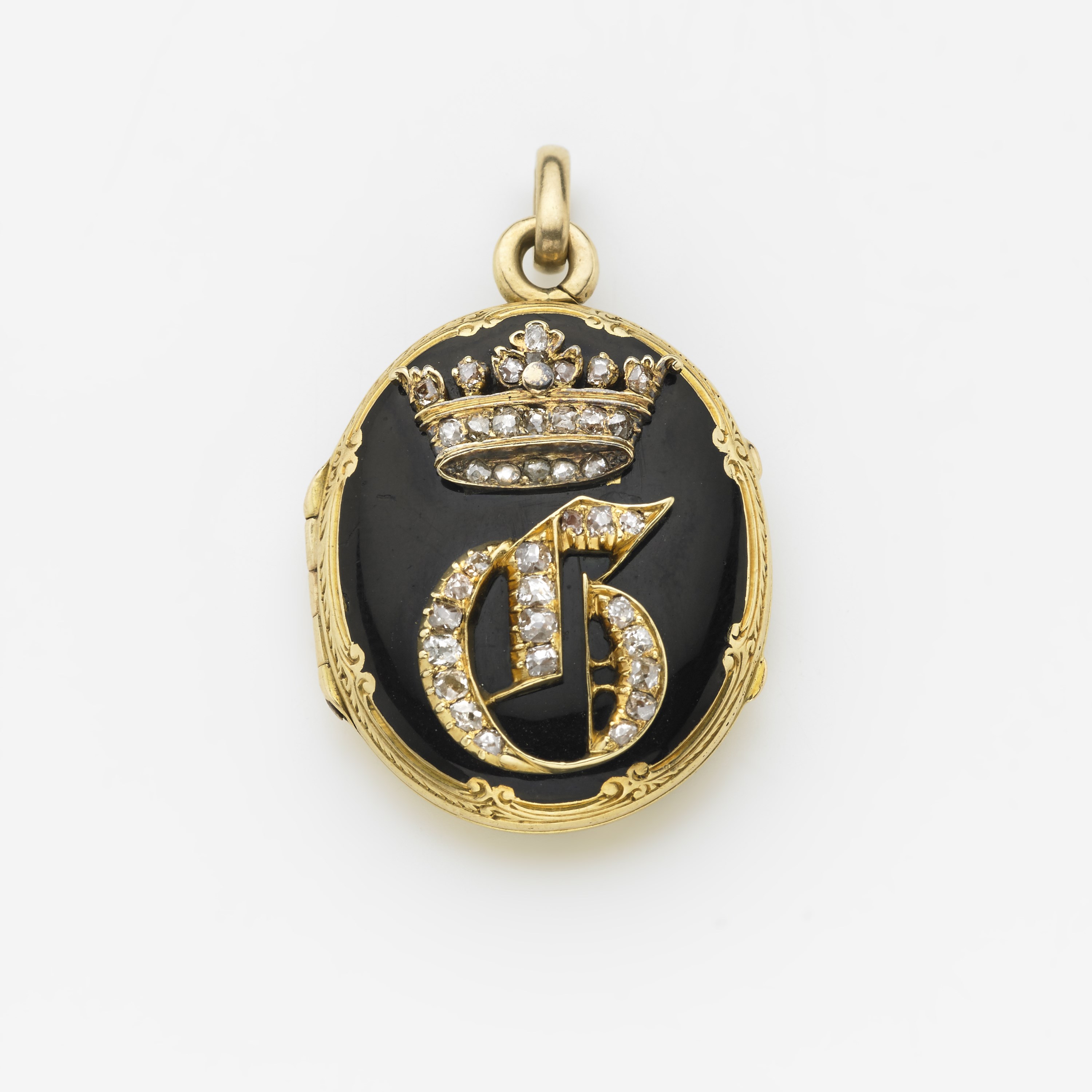 Pendente portaritratti in oro giallo e smalto nero, con in rilievo la lettera G in alfabeto gotico e corona con diamanti, g. 14,80 Prov.: prozio paterno Jean (Giambattista) Marchese Guerrieri Gonzaga Black enamel and gold pendant locket Provenance: great uncle Jean (Giambattista) Marquess Guerrieri Gonzaga