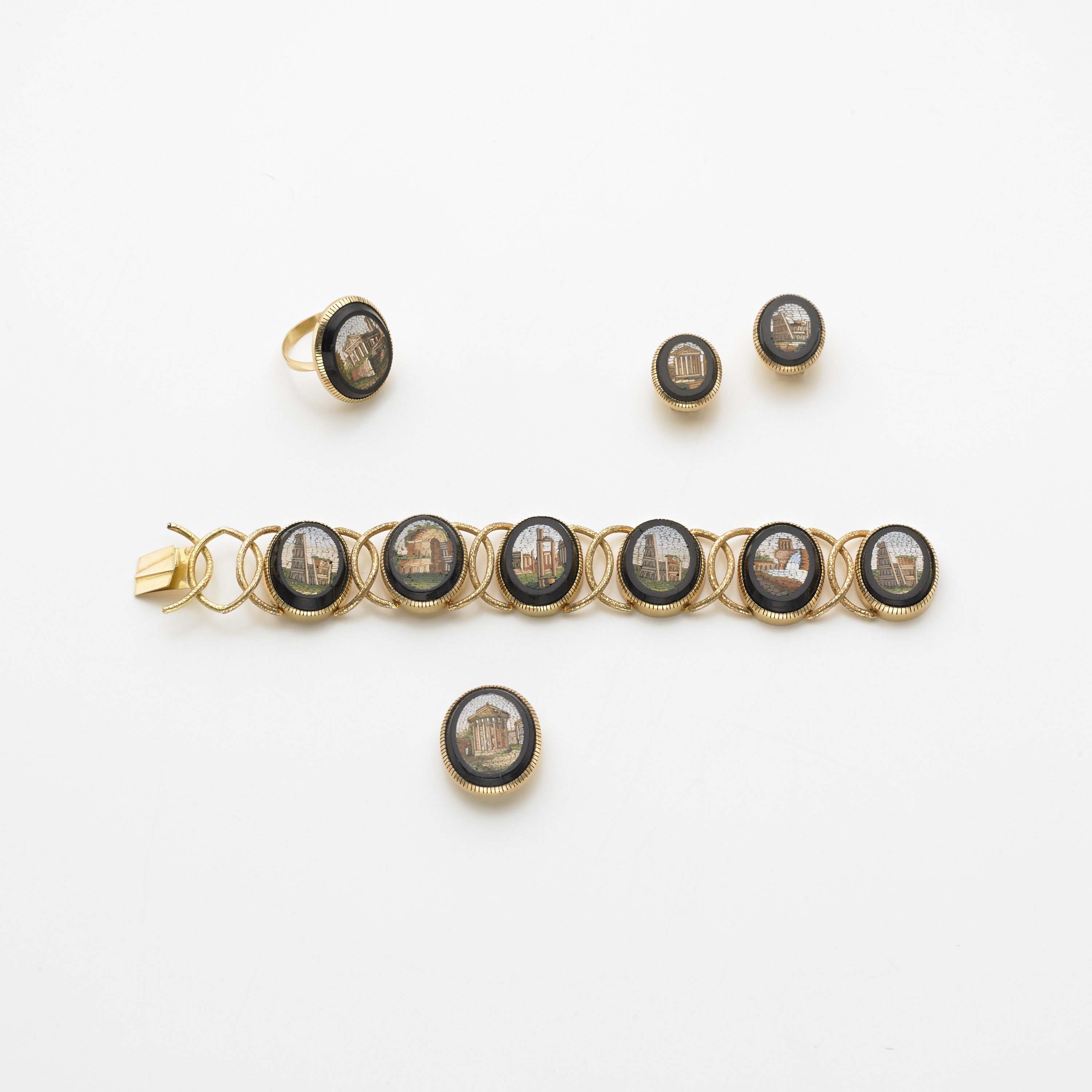 Parure in oro giallo con micromosaico su onice a rappresentare monumenti di Roma, composta da bracciale, orecchini a lobo, spilla ed anello, per complessivi g. 118,10 Set of micromosaic on onyx jewellery comprising a bracelet a pair of earings a brooch and a ring