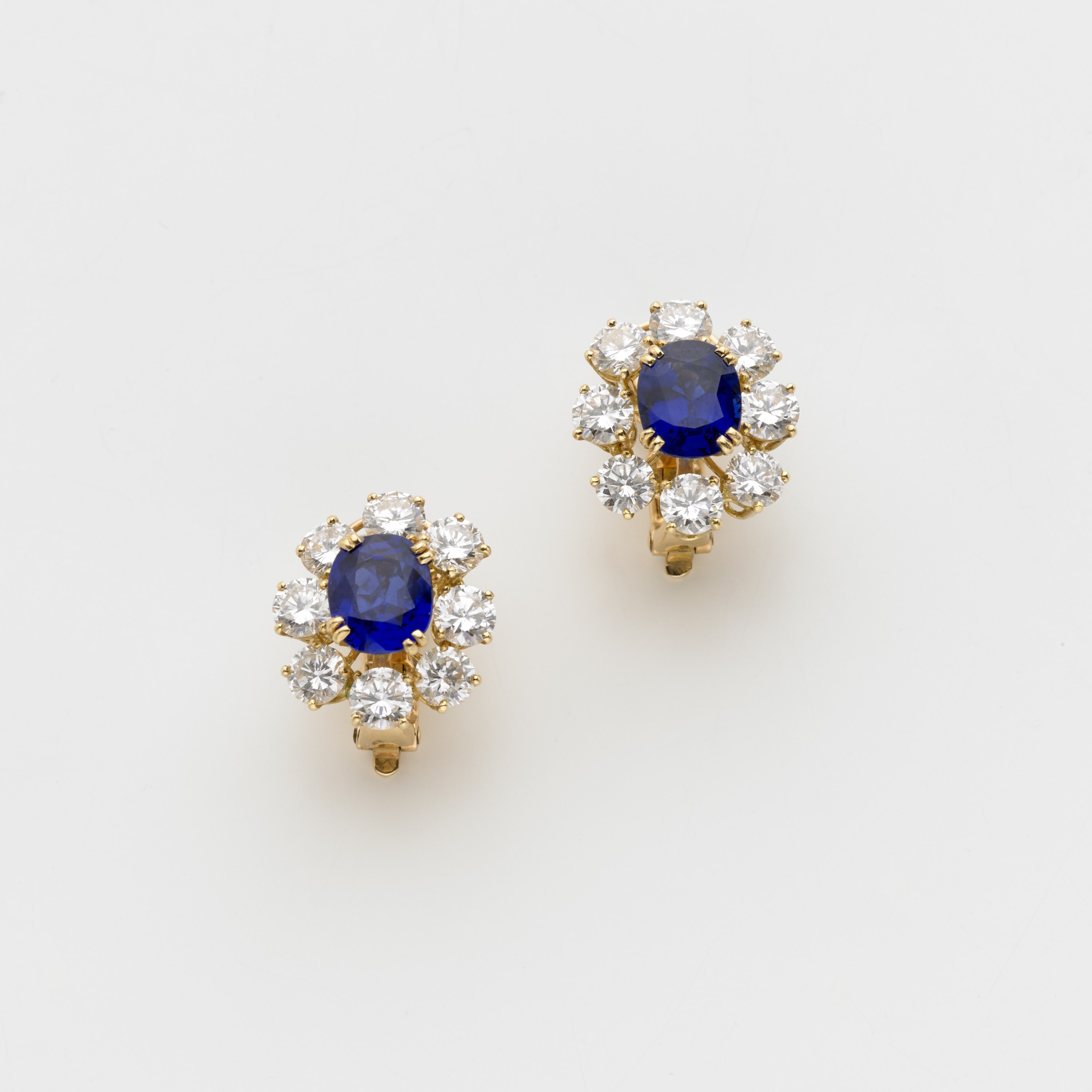 BOUCHERON PARIS Orecchini a lobo in oro giallo con sedici diamanti rotondi taglio a brillante a contornare due zaffiri ovali taglio composito diamanti ct 5 circa, e zaffiri complessivi ct 5 circa , g.10,90. Numero di serie 70 Sapphire and diamond gold cluster earings