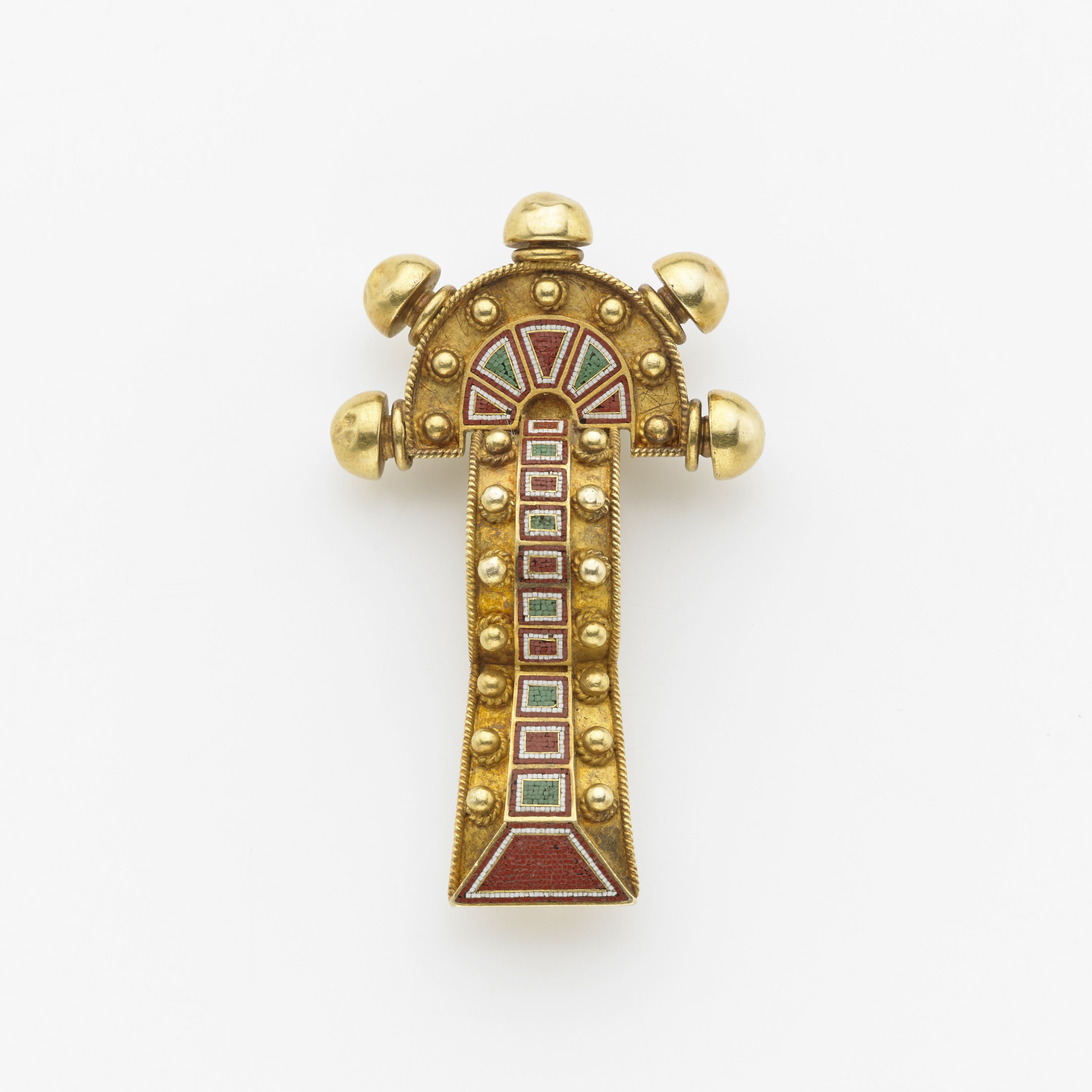 CASTELLANI Spilla in oro giallo con piccoli micromosaici geometrici sui toni del bianco, del verde e del mattone, a ricordare il periodo medioevale su iconografia bizantina (difetti), g.30,60 Micro mosaic gold brooch (defects)