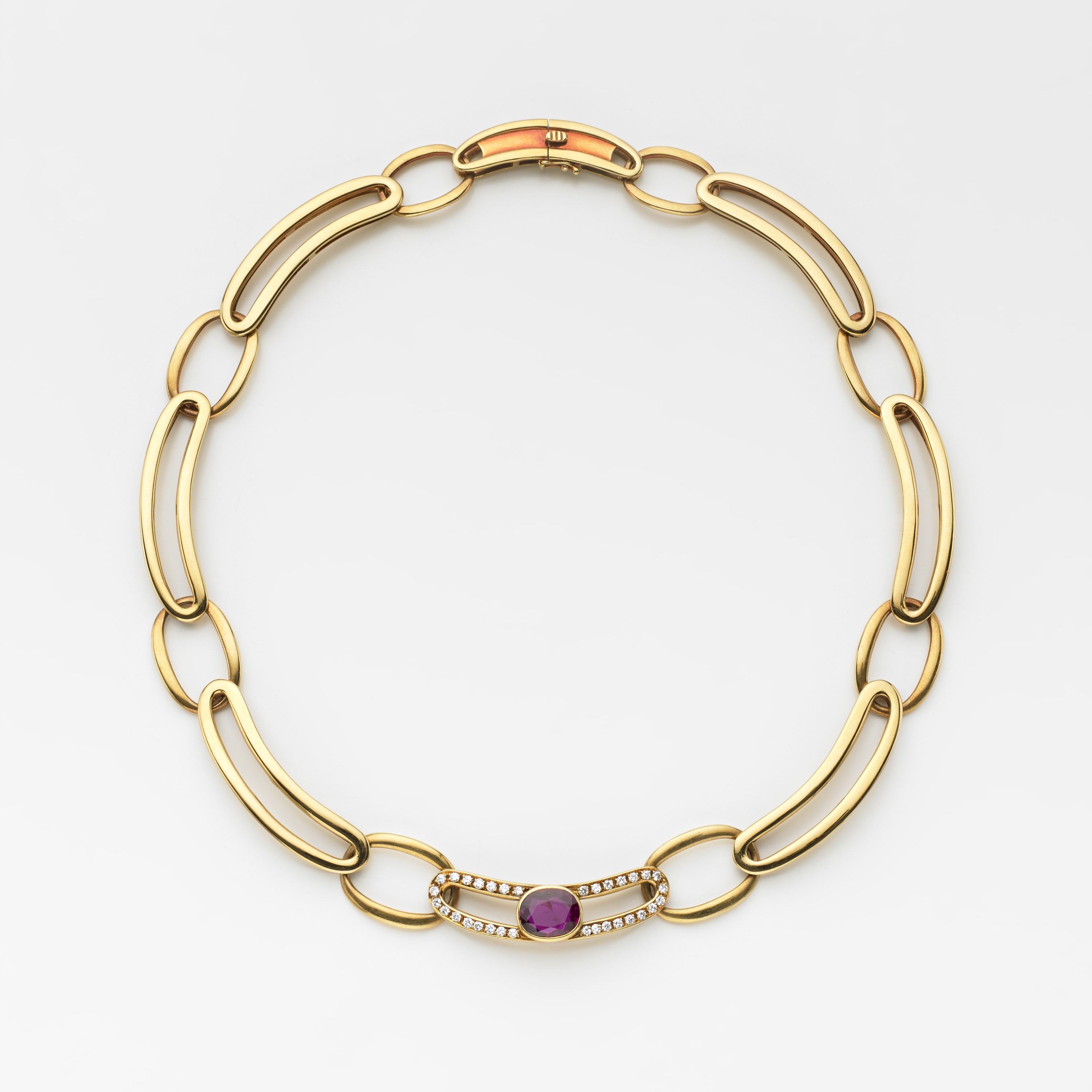 SCAVIA Collier in oro giallo con rubino centrale ovale taglio composito e piccoli diamanti lungh. cm 44.00, g.66,40 Ruby and diamond gold necklace