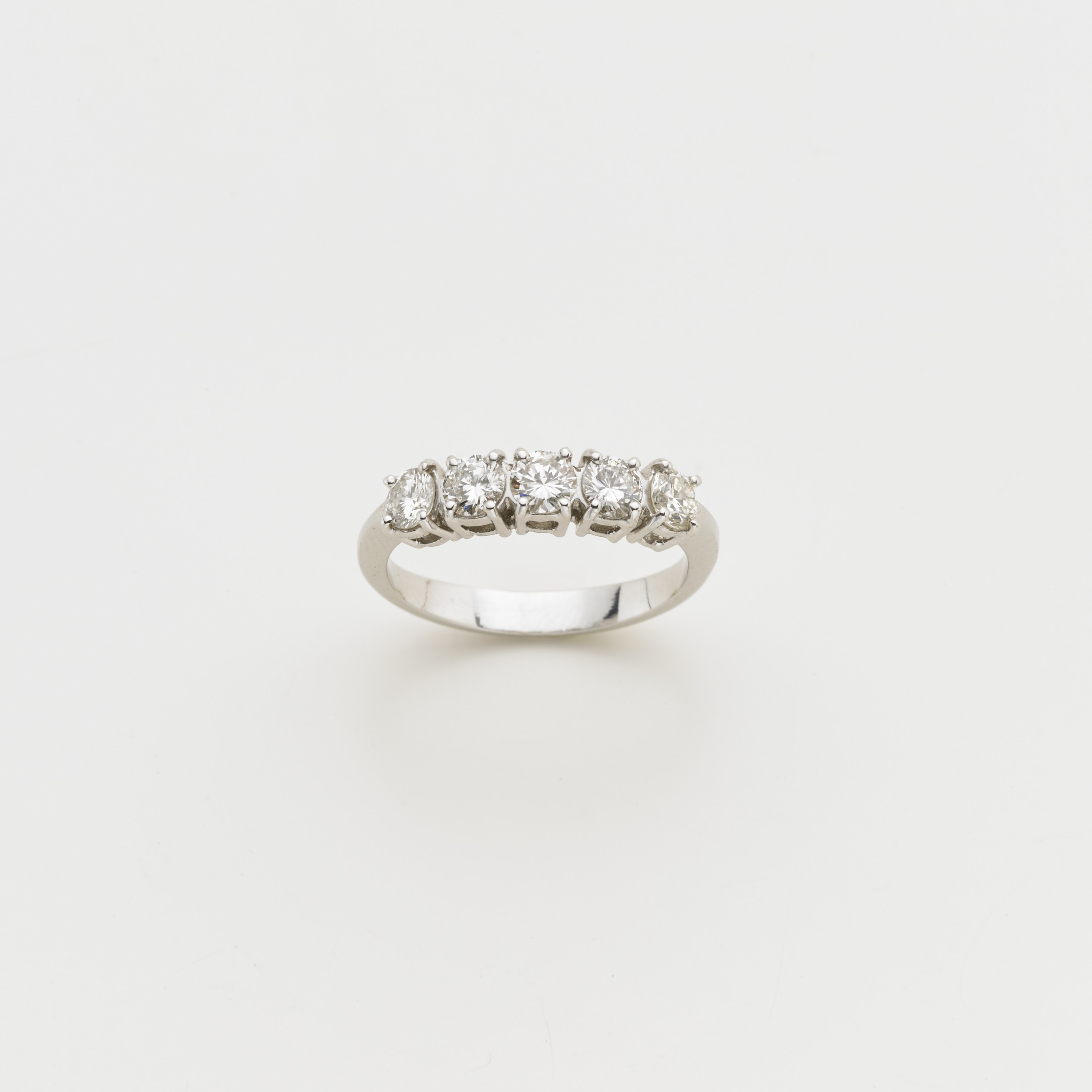 Anello in oro bianco con cinque diamanti rotondi taglio a brillante per complessivi ct 1,40 circa colore F/G purezza VS, g. 4,30, misura 19/59 Five diamond white gold ring